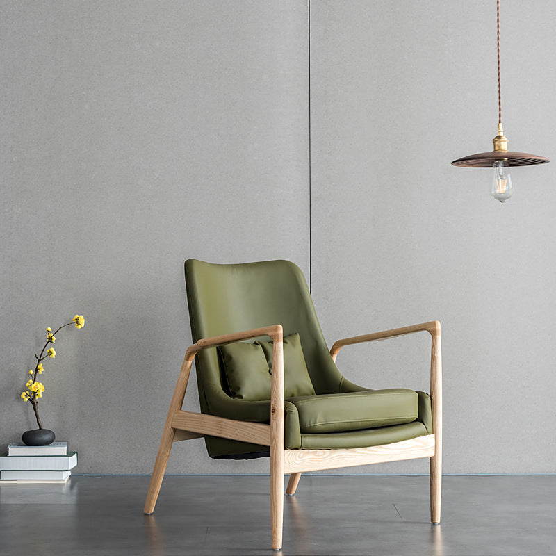 Contemporary Nordic Rectangular Wood Leather Accent Chair Backrest Armrest For Living Room