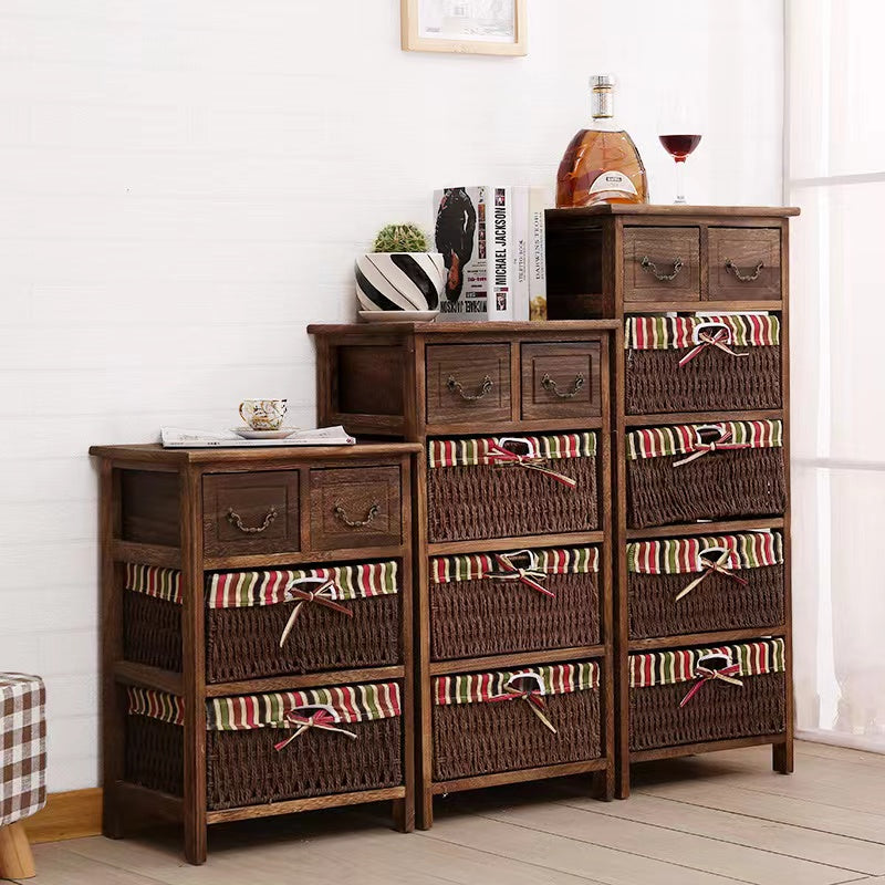 Traditional Rustic Rectangle Cube Storage Cabinet Paulownia Wood Striped Fabric Hardware Rattan Weaving Side Table 3/4/5 - Tier For Living Room