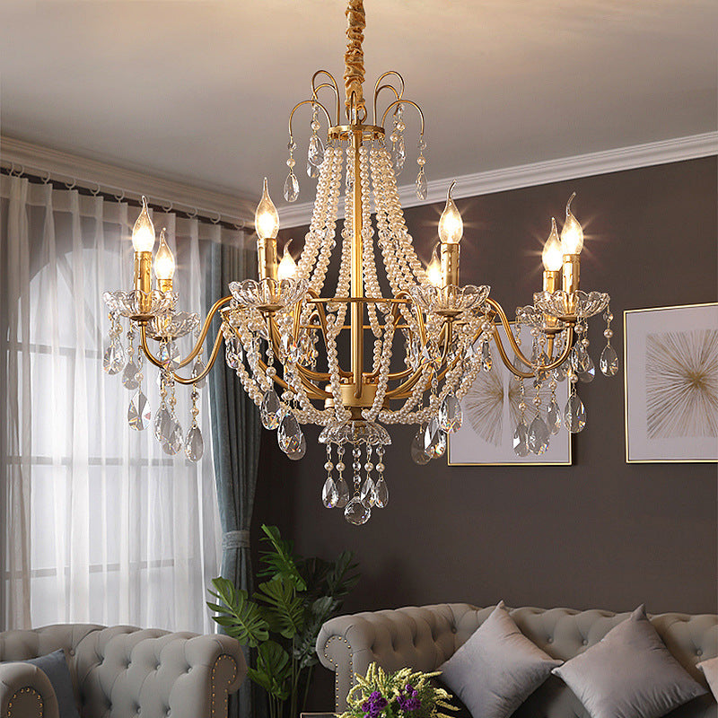 Traditional French Pearl Candle Round Iron Crystal Glass 3/6/8 Light Chandelier For Living Room
