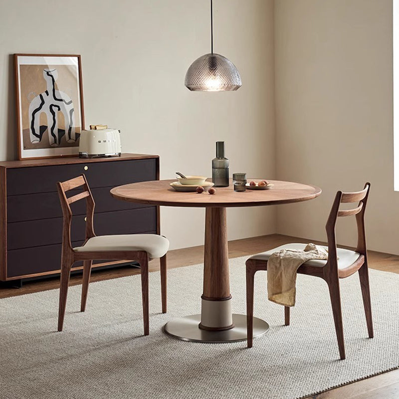 Contemporary Retro Round Walnut Saddle Leather Stainless Steel Dining Table & Chair Set For 2/4/6/8 Seats