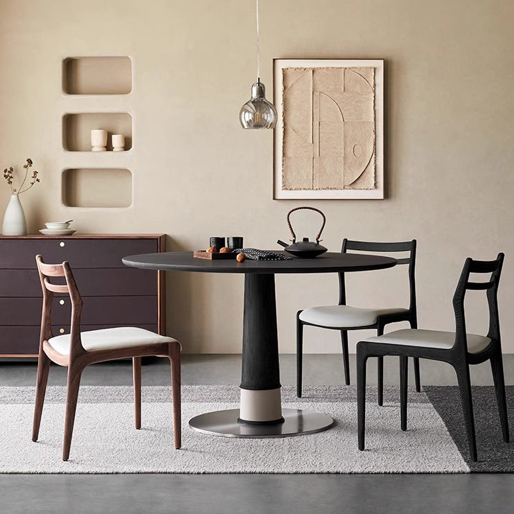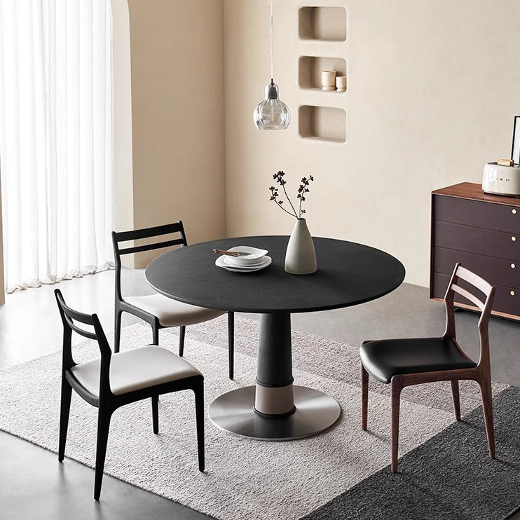 Contemporary Retro Ash Wood Slab Leather Stainless Steel Round Dining Table & Chair Set For 2-6 Seats