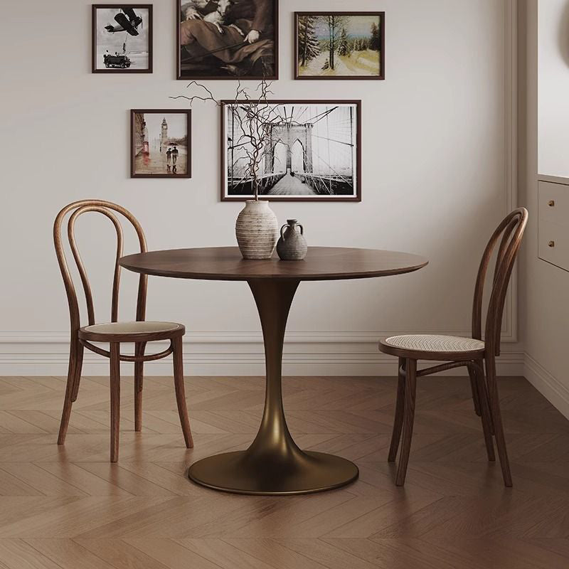 Contemporary Retro Round Walnut Copper Rattan Dining Table & Chair Set For 2 Seats