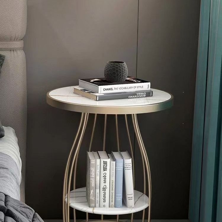 Contemporary Luxury Round Rock Slab Iron End Table 2-Tier For Living Room