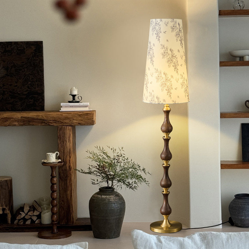 Traditional Vintage Printed Fabric Shade Copper Solid Wood Base 1-Light Standing Floor Lamp For Bedroom
