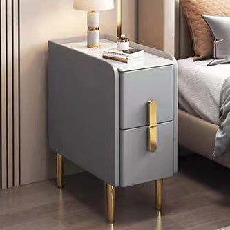 Contemporary Nordic Slab Leather Solid Wood And Carbon Steel Narrow Rectangular Nightstand With 2 Drawers For Bedroom