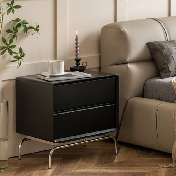 Contemporary Retro Leather Solid Wood Square Nightstand 2-Drawer For Bedroom