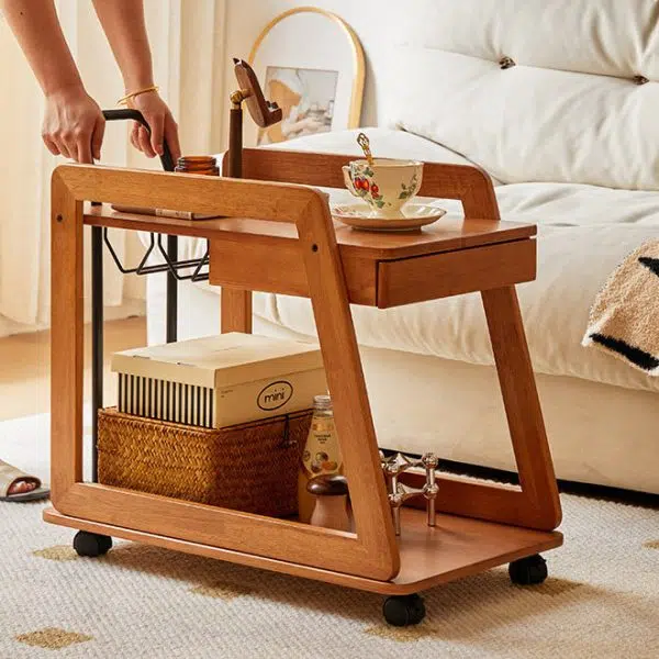 Contemporary Scandinavian Solid Wood Iron Trapezoid Movable End Table 2-Tier For Living Room & Dining Room