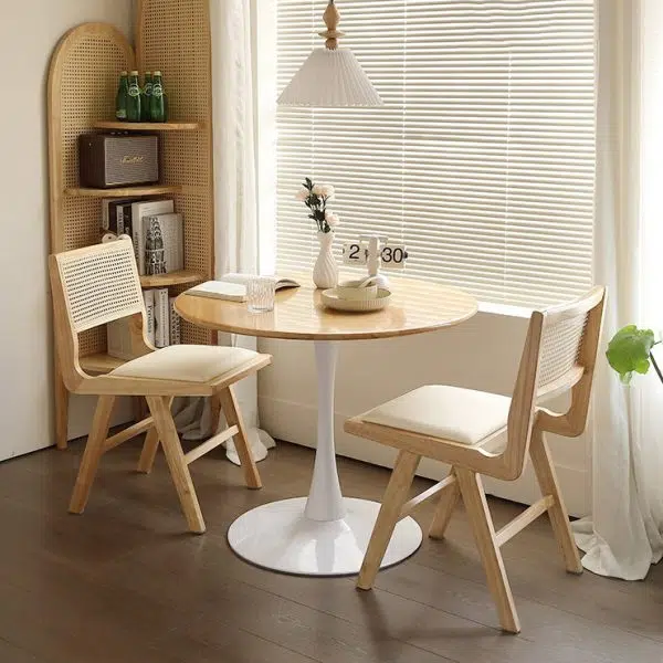 Contemporary Retro Beech Wood & Rattan Round Dining Chair With Backrest And Footrest For Dining Room