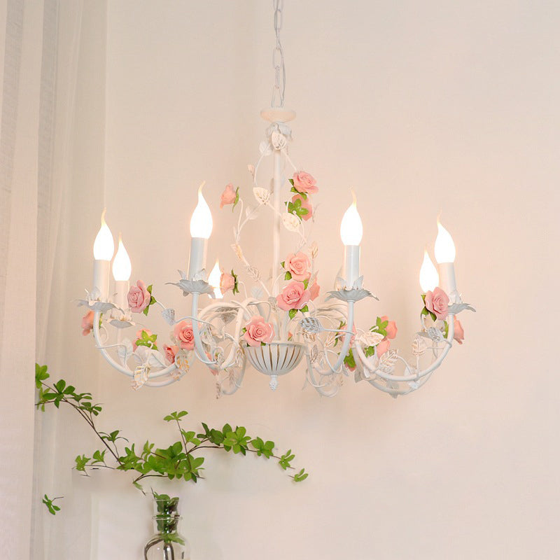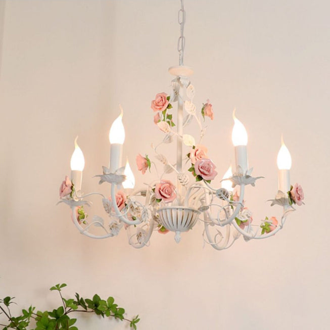 Traditional French Iron Ceramic Rose Branch Candlestick 3/6/8 Light Chandeliers For Living Room
