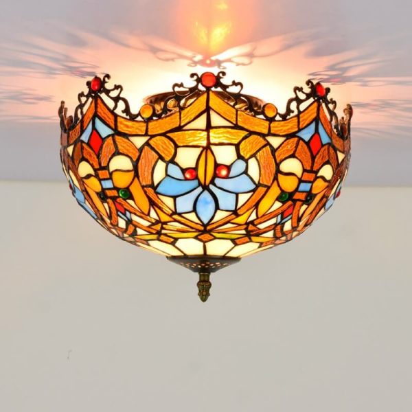 Vintage Tiffany Stained Glass Bowl Shape 2-Light Flush Mount Ceiling Light