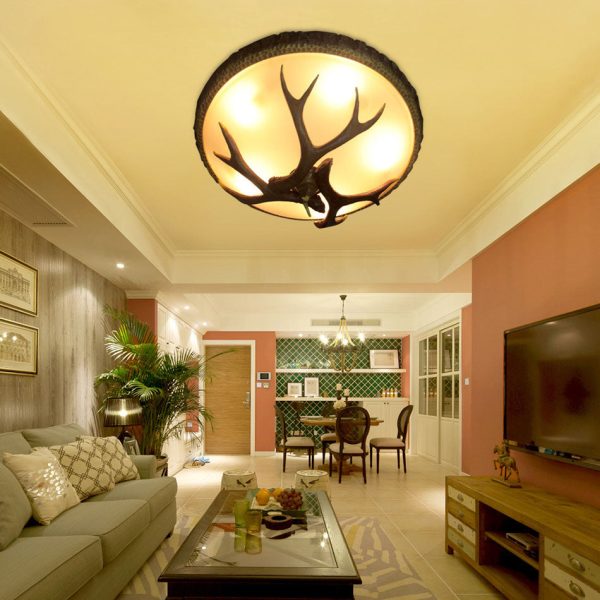 Vintage Industrial Antler Resin Glass Round 2/3/5 Light Flush Mount Ceiling Light