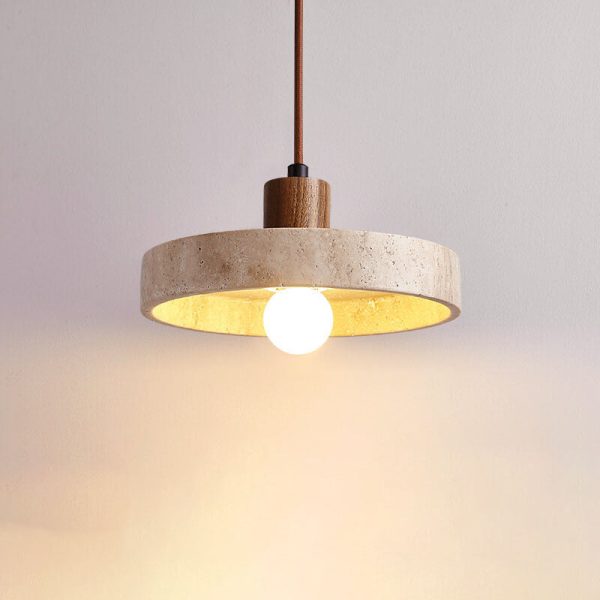 Japanese Minimalist Solid Wood Disc Yellow Travertine Base 1-Light Pendant Light