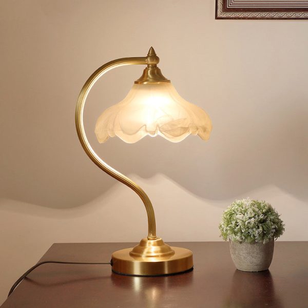 Traditional European Brass Glass Floral Shade Round Base 1-Light Table Lamp For Bedroom
