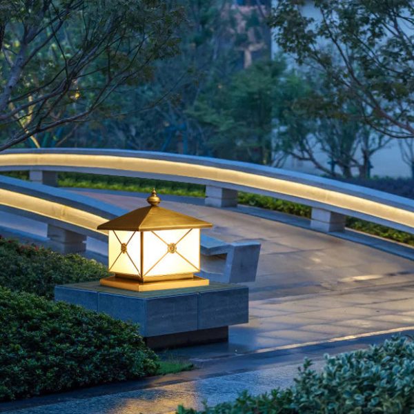 Traditional Chinese Square Full Copper Glass 1-Light Solar Outdoor Post Head Light For Garden