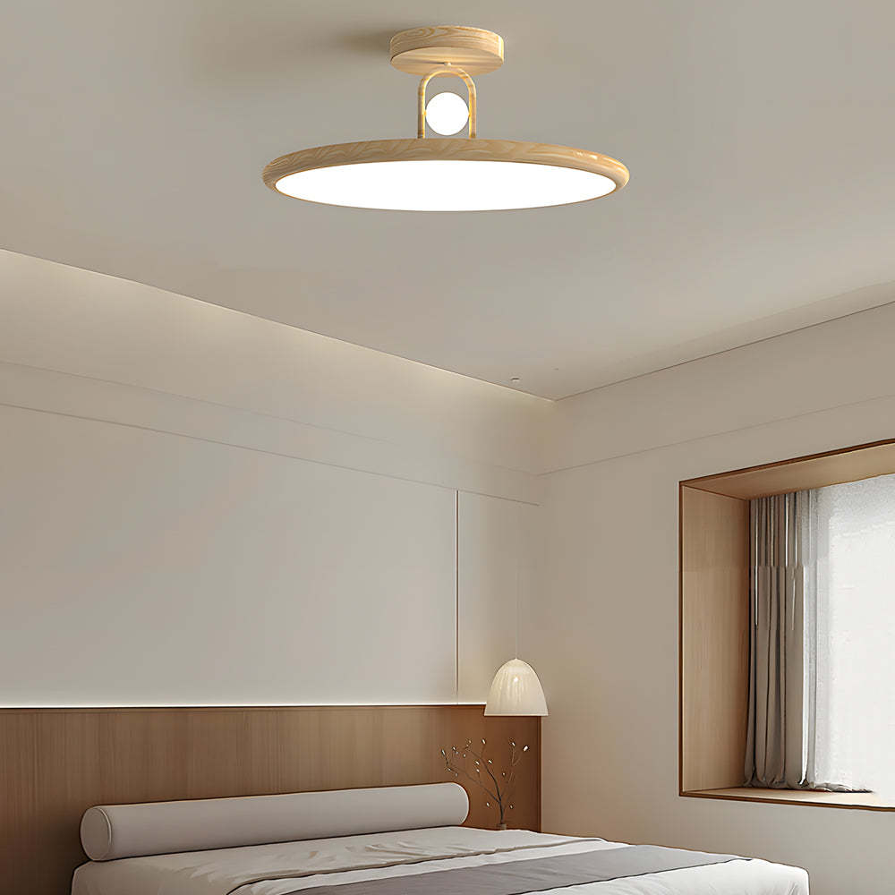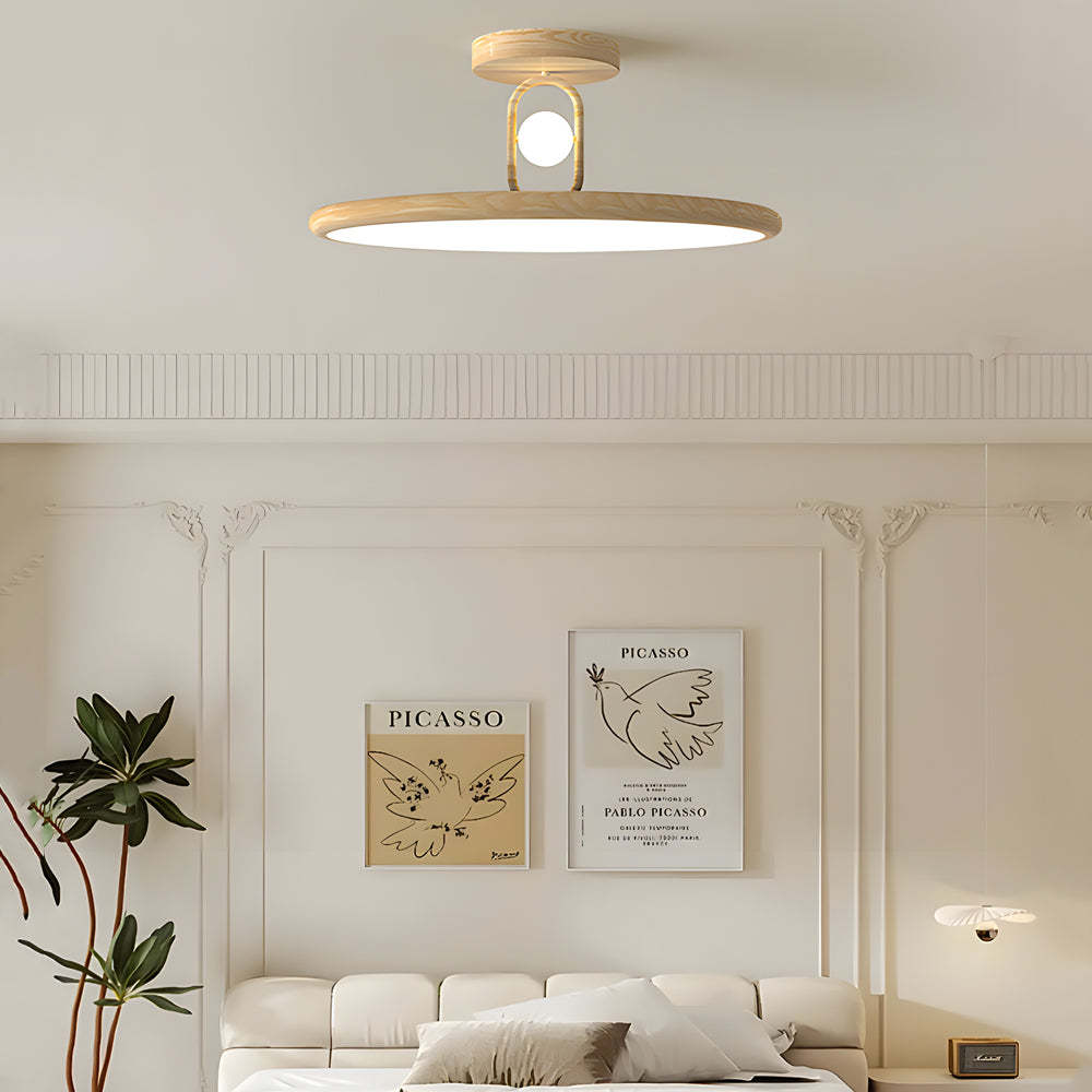 - This retro semi-flush ceiling light creates a striking focal point in any interior space. The main body is a round lamp body, which is connected to the ceiling mounting plate through a small white spherical lampshade embedded in an oval frame. The fixture's robust iron construction is enhanced with two stunning finishes, Walnut Wood Grain and Wood Grain, offering versatility to complement various decor themes.