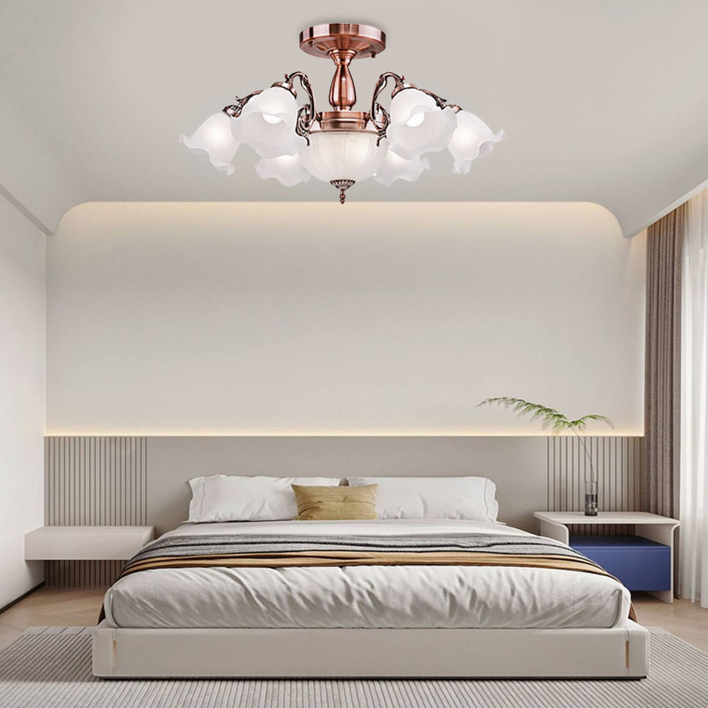 - This classic pendant lamp is made of metal and glass materials. and its lamp body is treated with an electroplating process. which is more refined and durable. The traditional flower shaped glass lampshade has high light transmittance. presenting a bright and warm lighting effect.