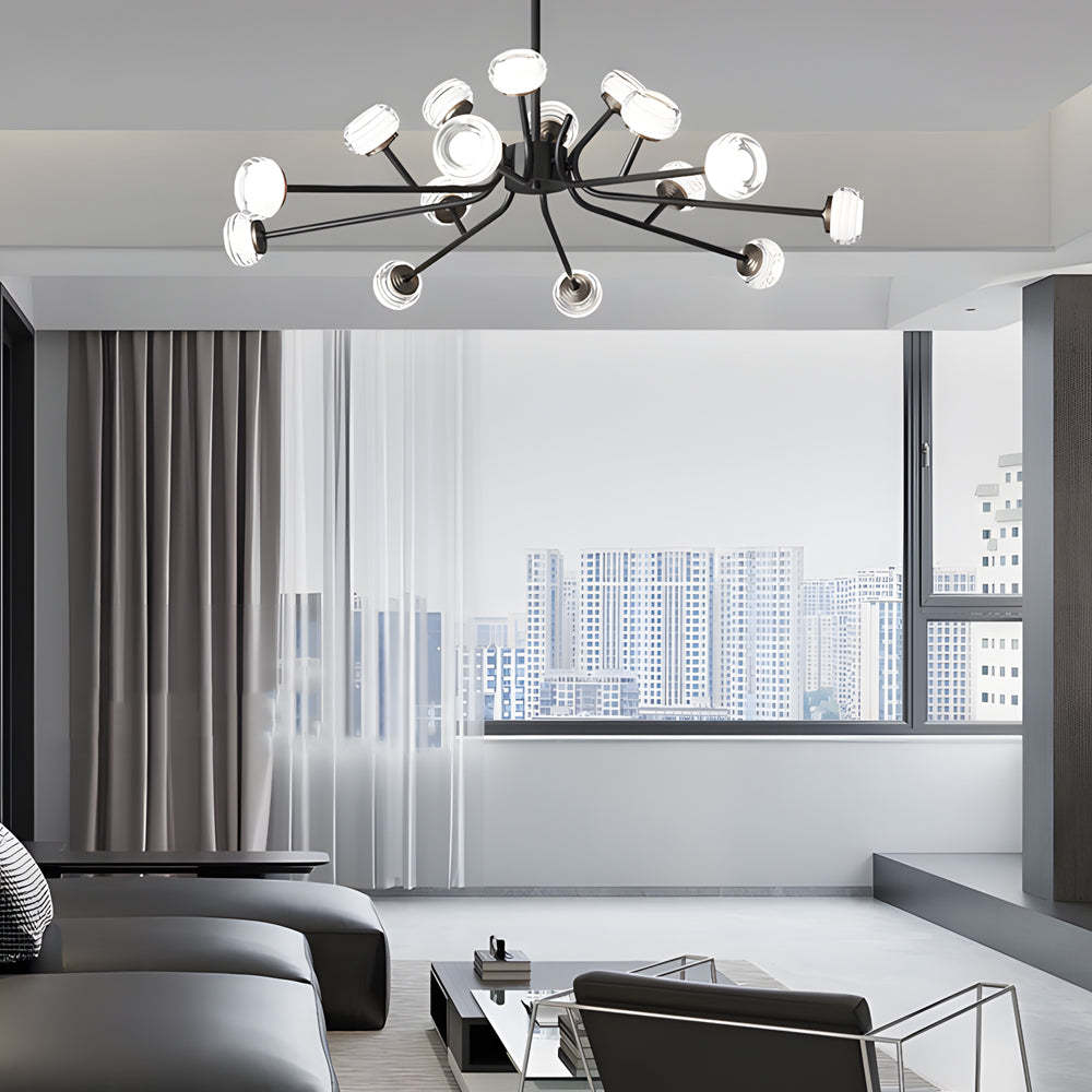 - The smooth streamlined shape brings a fresh view to this modern Black LED Sputnik Chandelier. Crafted from quality copper and clear UV acrylic, this fixture features a modern Sputnik silhouette, with black curved arms gracefully extending from a central rod in all directions.