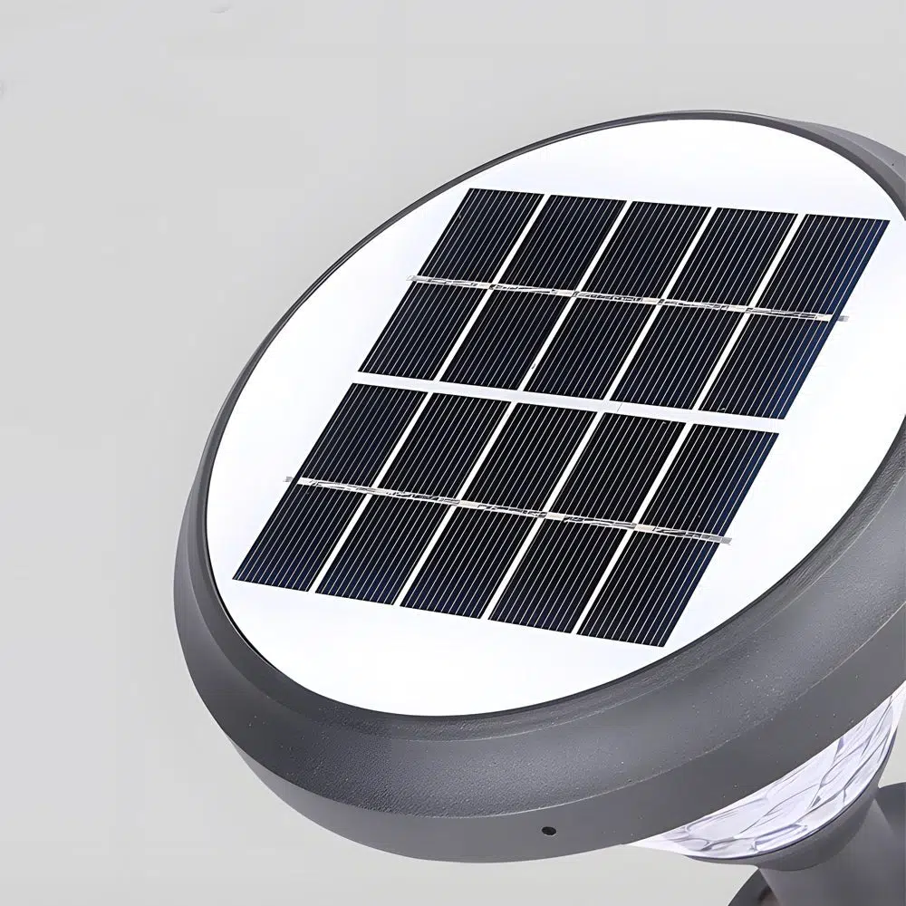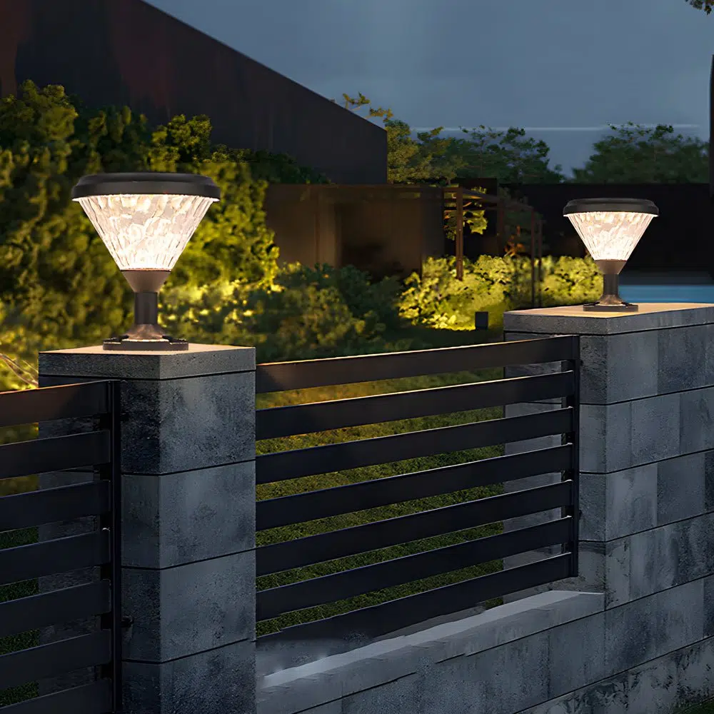 - A round top hosts solar panels for illumination that require no additional wiring. built-in non-dimmable LED. perfect for lighting pier and post mountings on your fence. deck. patio. porch. and beyond. Water PC panels shade the light. delivering refracted lighting that gives off a beautiful glow from dusk to dawn.