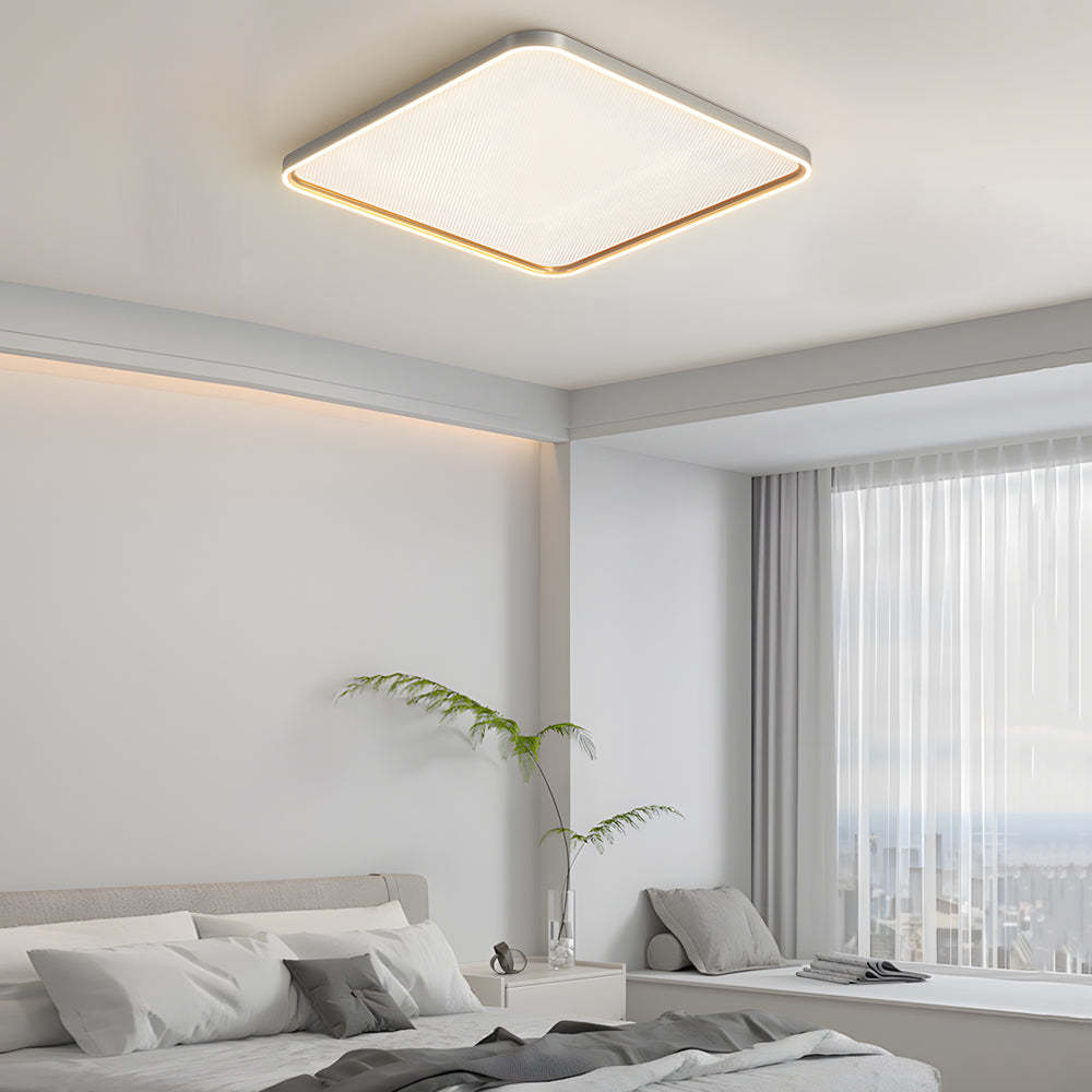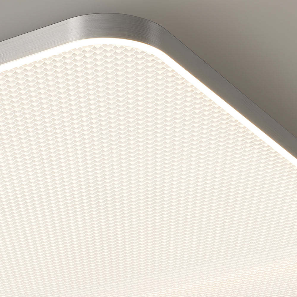 - The geometric shape of this flush LED ceiling light adds precision to its simple style. This ceiling light features a white acrylic diamond plate diffuser for excellent illumination. A brushed gray finish accents the aluminum framework and brings a contemporary touch to its minimalist, geometric silhouette.