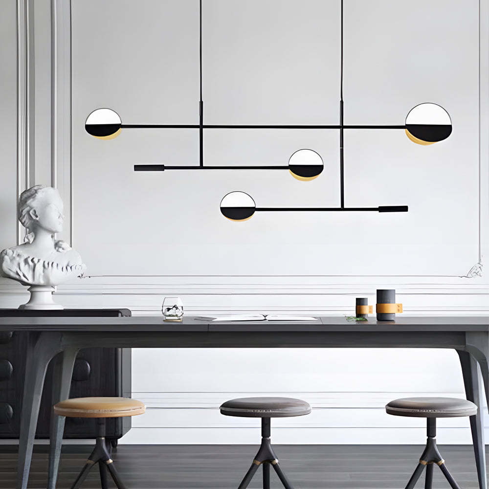 - Experience the perfect blend of functionality and artistic design with our Chic Modern LED Linear Pendant Lamp. Crafted from high-quality iron, this fixture features elegantly bent iron rods and lampshades that interlock in a visually harmonious array, creating a structured yet graceful form.