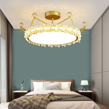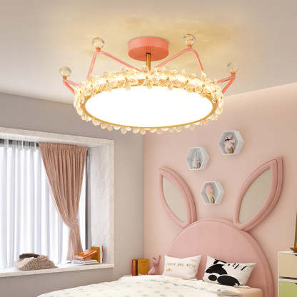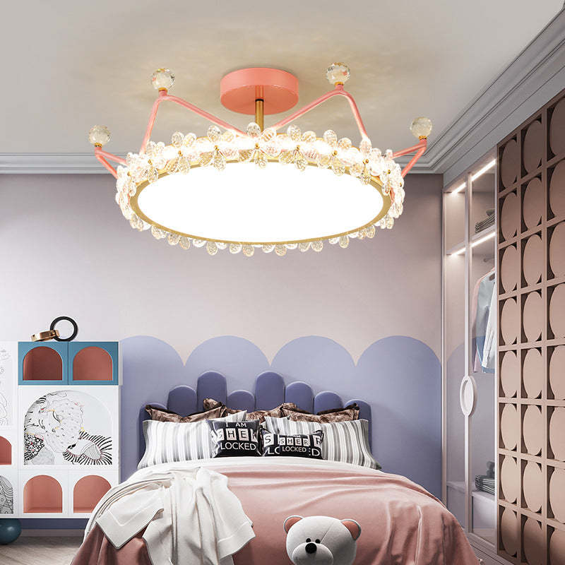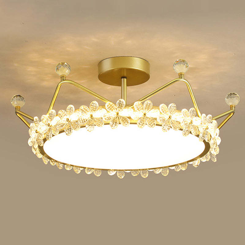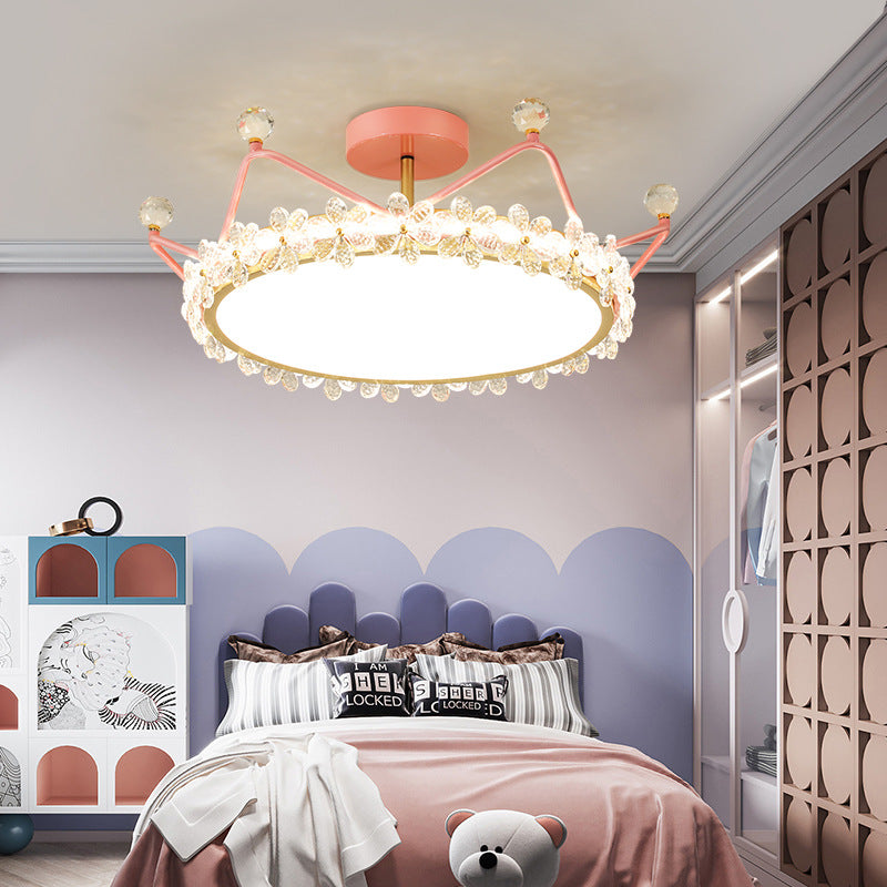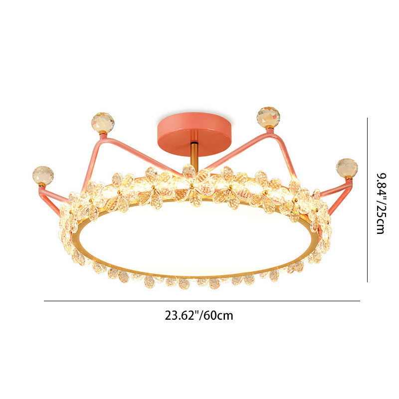 Contemporary Creative Kids Romantic Flower Crown Round Iron Acrylic Crystal LED Semi-Flush Mount Ceiling Light For Bedroom