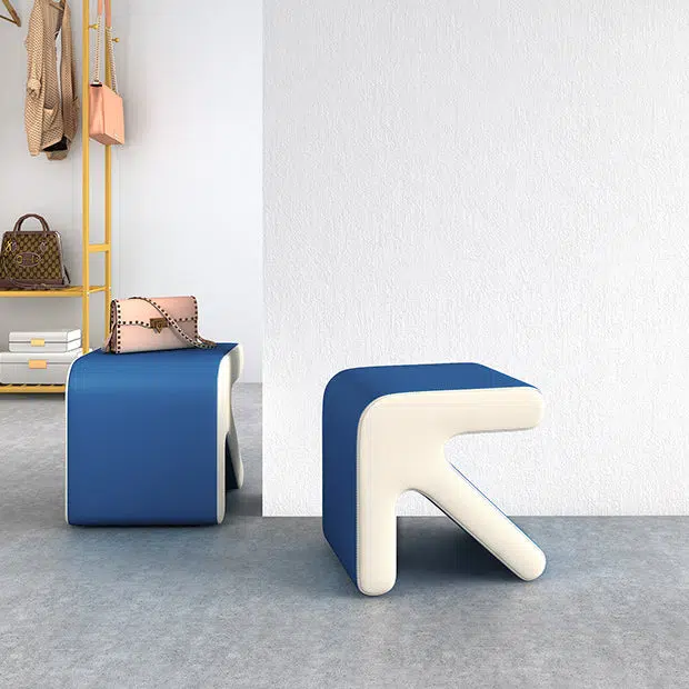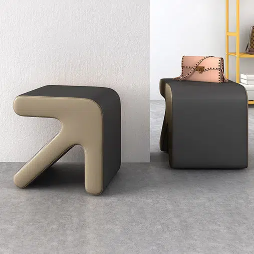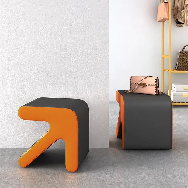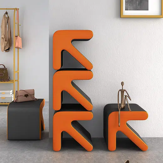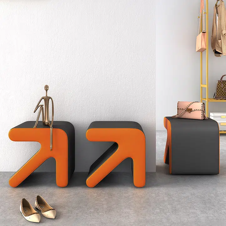 This contemporary creative stool features a unique arrow-shaped design with a leather seat and wooden frame. perfect for your entryway or living room. Available in orange. white. and gray. this stackable stool offers a space-saving solution for quick seating or shoe-changing. adding a modern. stylish touch to any small space.
