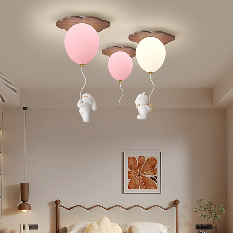 This contemporary semi-flush mount ceiling light features a playful balloon-inspired design with adorable panda. bunny. and flower elements. crafted from PE and rubberwood in soft white and pink tones. With high color rendering. flicker-free LED light. and no blue light hazard. it’s ideal for children’s bedrooms. hallways. and cozy living spaces.
