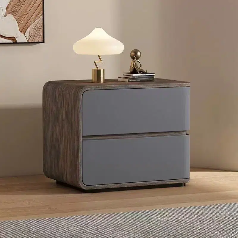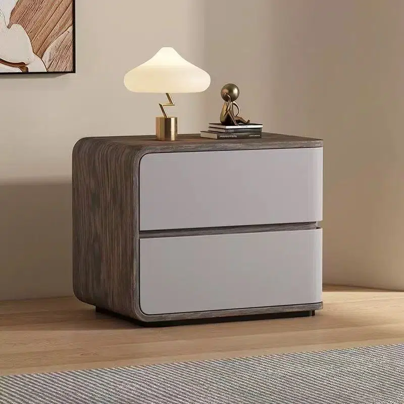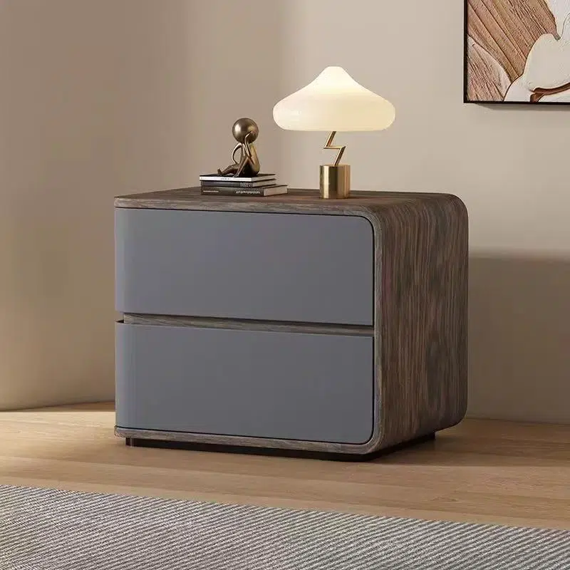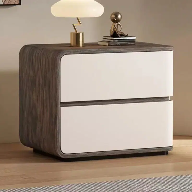 Featuring a walnut wood grain texture and smooth faux leather finish. this modern nightstand includes two drawers. a curved square design. and a protective edge to prevent drops. Available in cream. gray. white. and orange. it’s crafted with safety-rounded corners??ideal for elegant and functional bedroom organization.