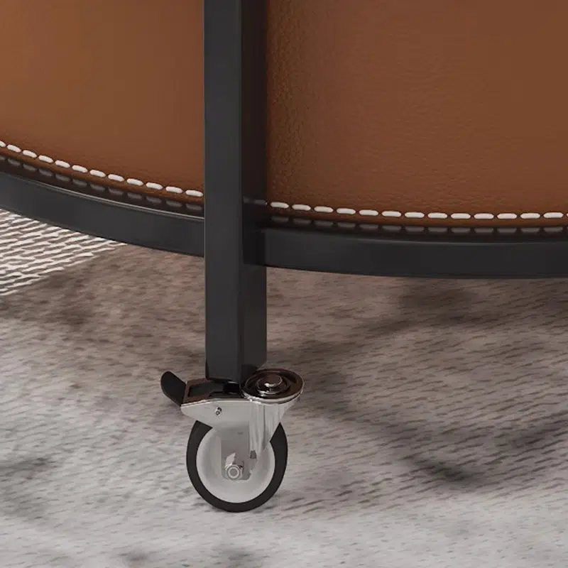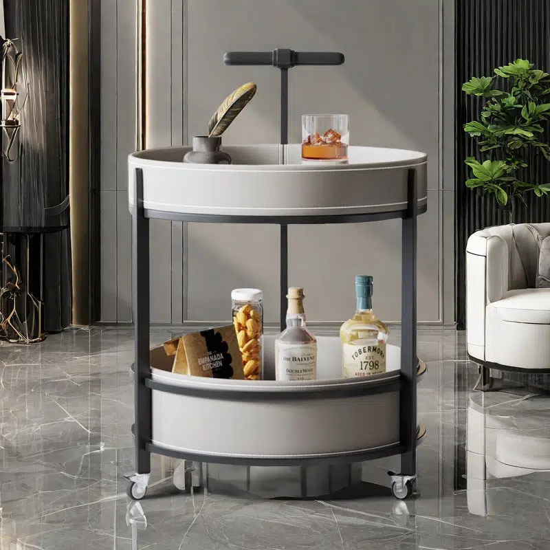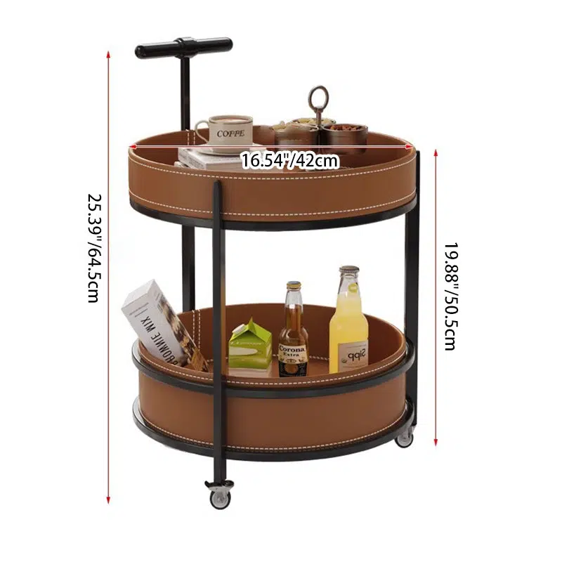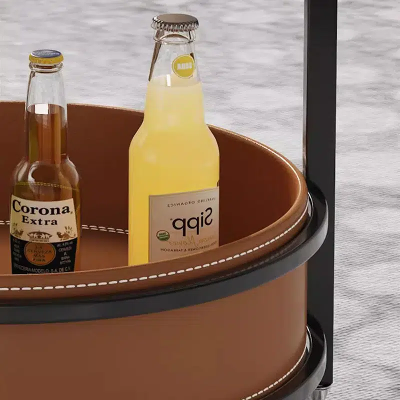 Contemporary Luxury Leather Round Top Iron Frame End Table Rolling Cart 2-Tier Storage Shelves For Living Room