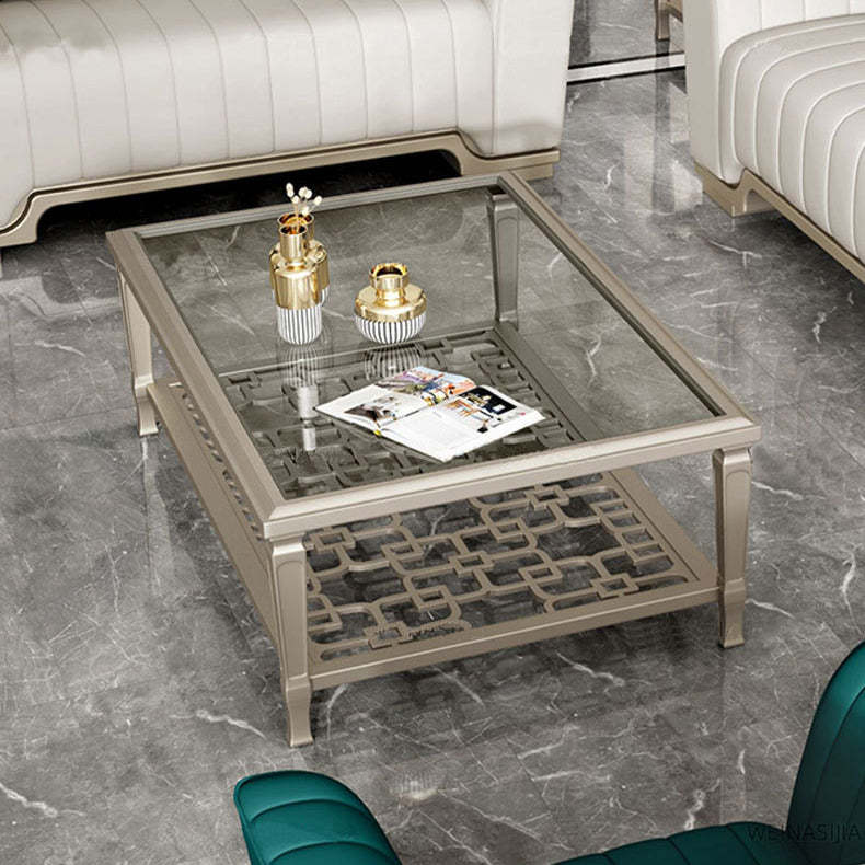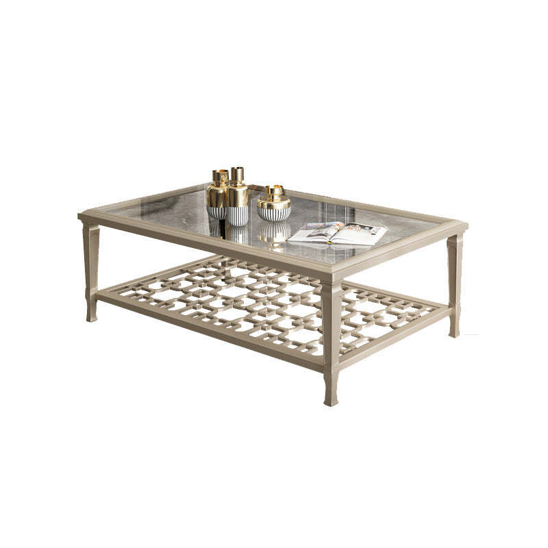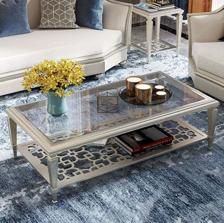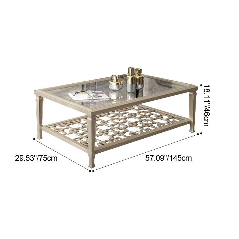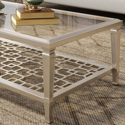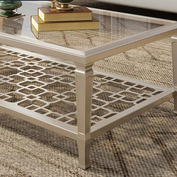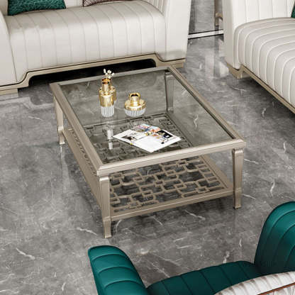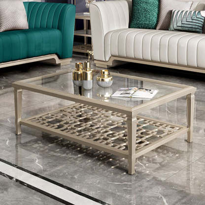 This contemporary Nordic coffee table combines a solid beech wood frame with tempered glass surfaces and an elegant champagne gold finish. Featuring a geometric hollow-carved design and two-tier structure. it's available in two sizes��perfect for adding modern sophistication and functional storage to any living room.