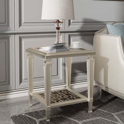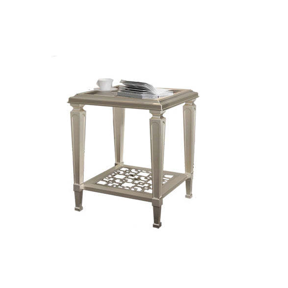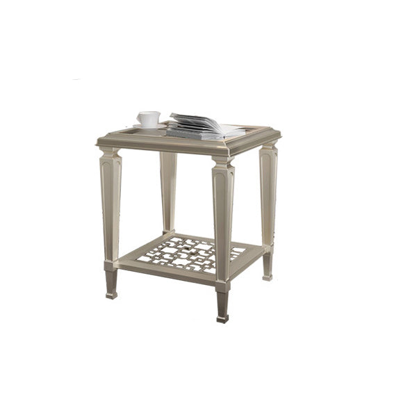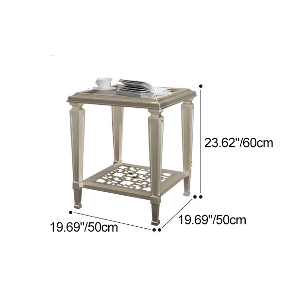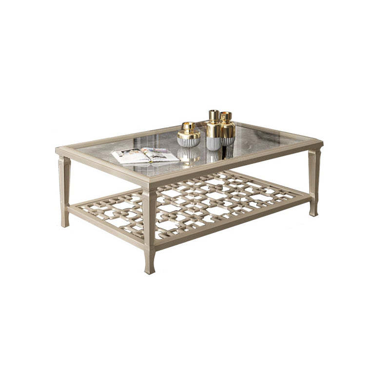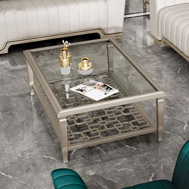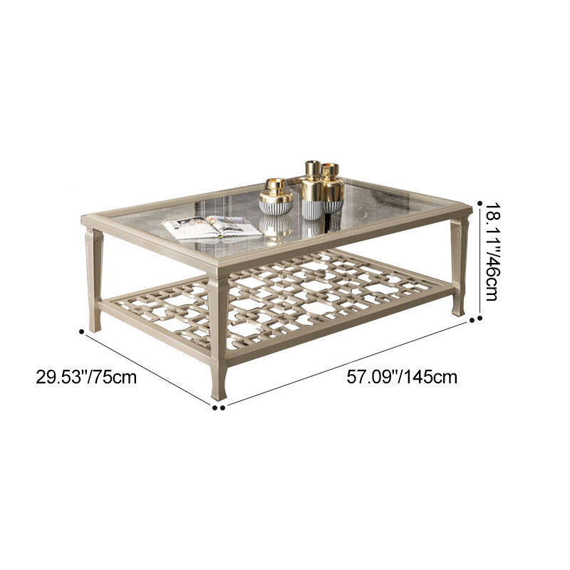 This contemporary Nordic coffee table combines a solid beech wood frame with tempered glass surfaces and an elegant champagne gold finish. Featuring a geometric hollow-carved design and two-tier structure. it's available in two sizes��perfect for adding modern sophistication and functional storage to any living room.
