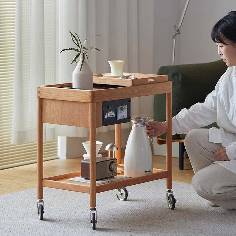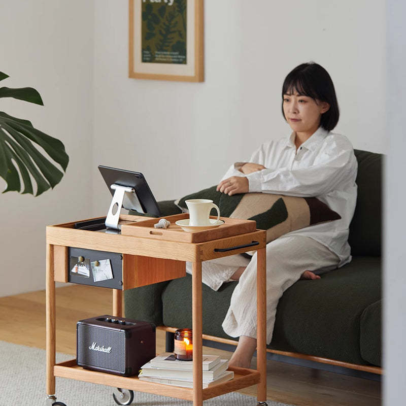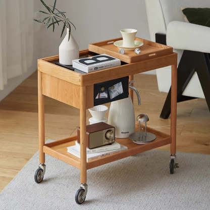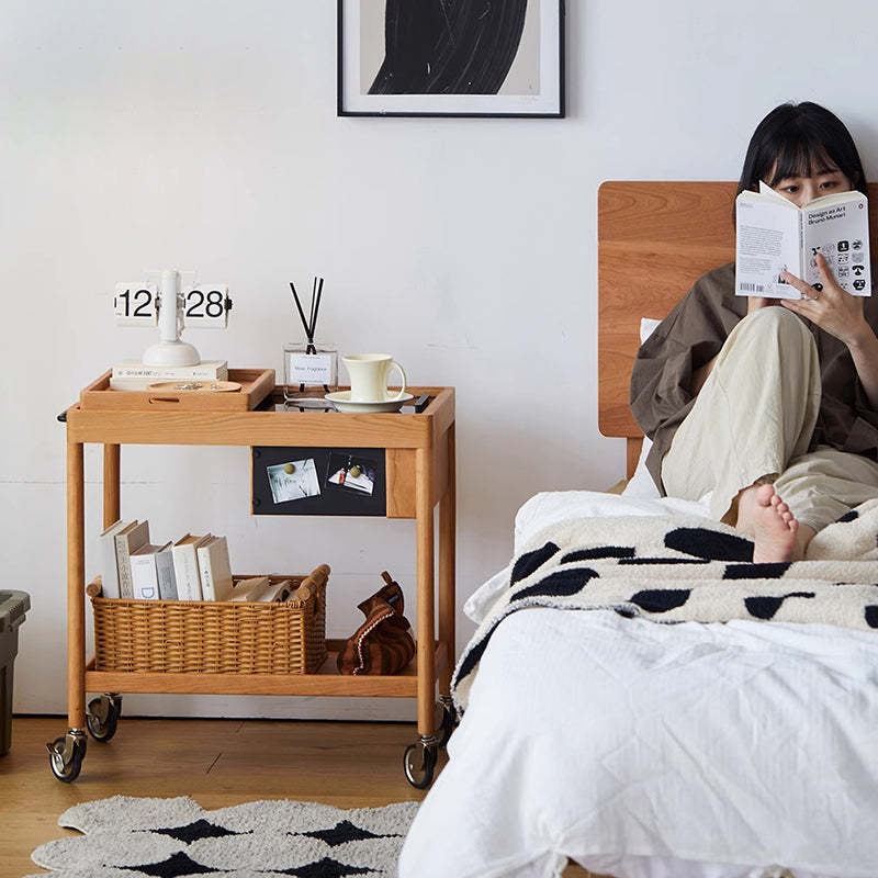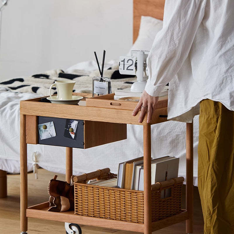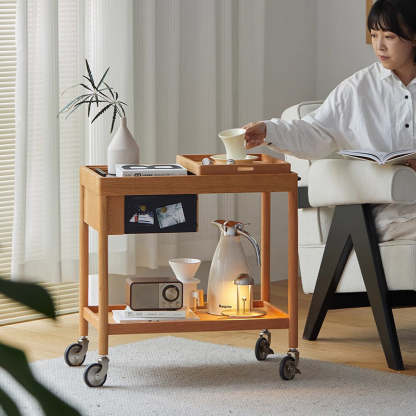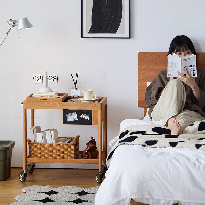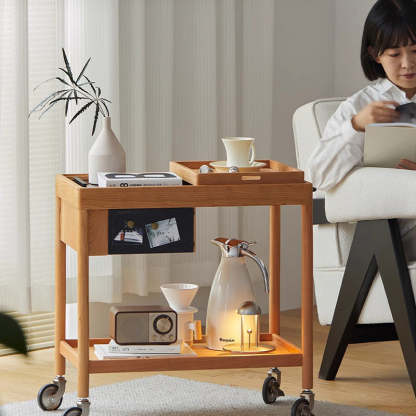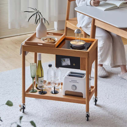This Nordic-style movable side table cart is crafted from cherry or white oak and features a durable glass tabletop. It features a sleek rectangular shape and warm wood tone. Designed with 2-tier storage. a removable top tray. and 360�� swivel wheels. it's perfect for small spaces in the living room or bedroom.