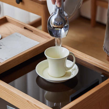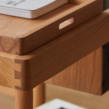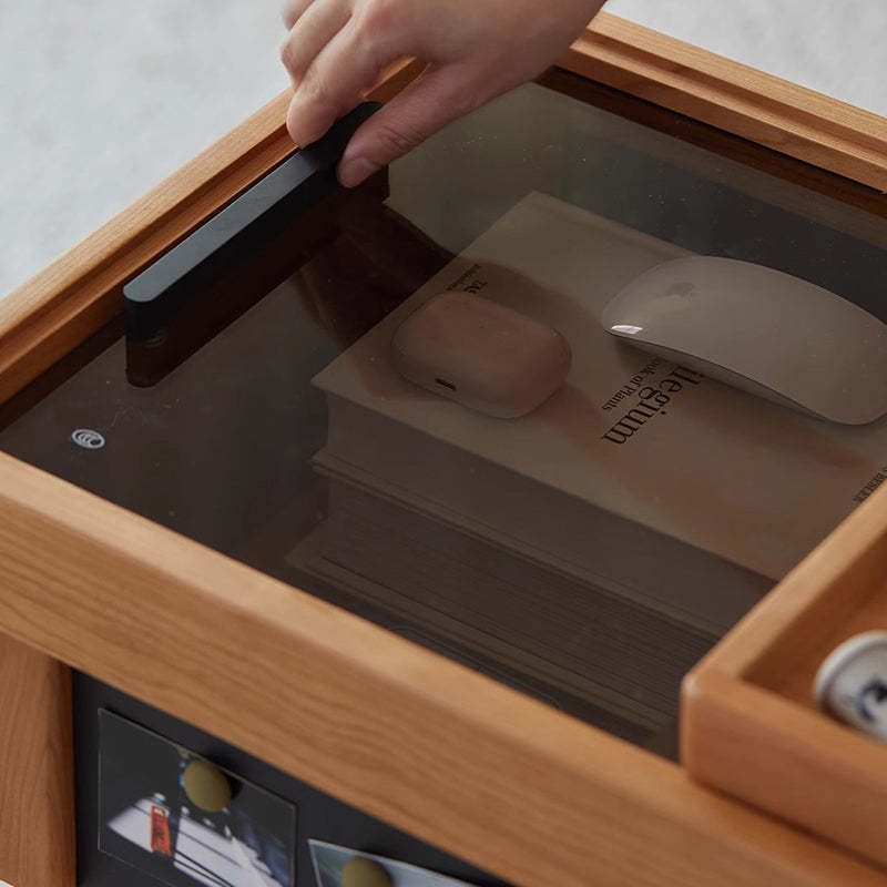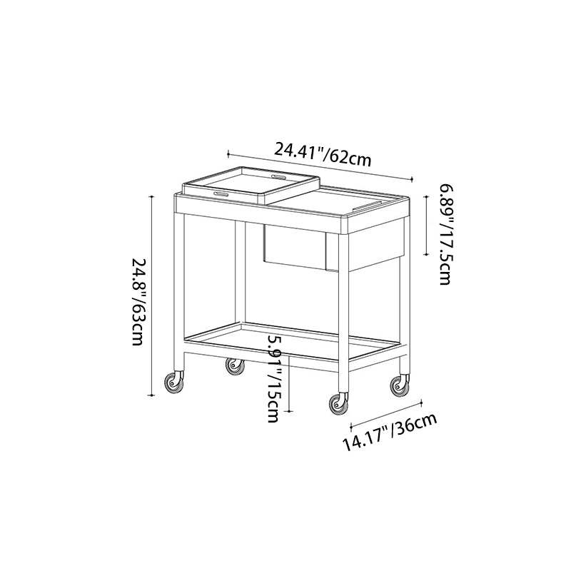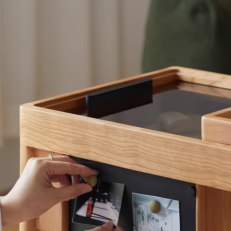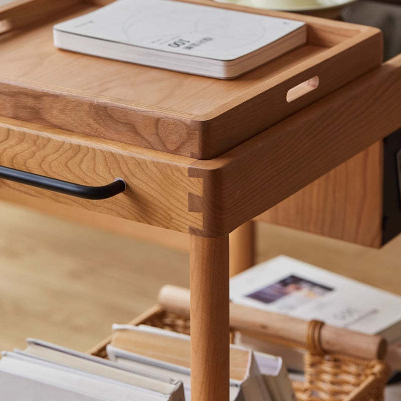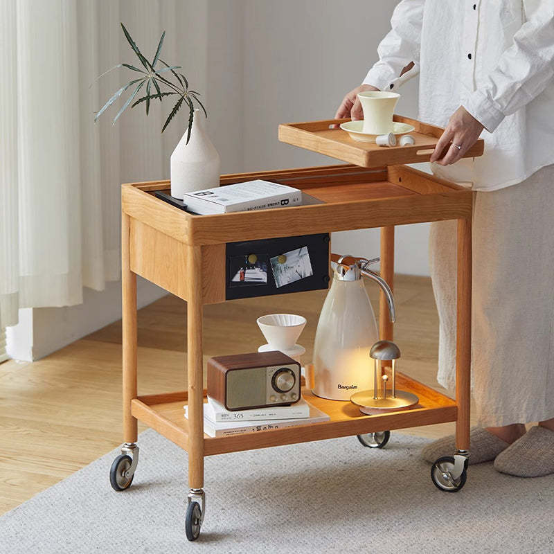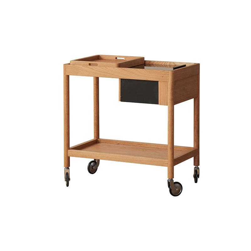 This Nordic-style movable side table cart is crafted from cherry or white oak and features a durable glass tabletop. It features a sleek rectangular shape and warm wood tone. Designed with 2-tier storage. a removable top tray. and 360�� swivel wheels. it's perfect for small spaces in the living room or bedroom.