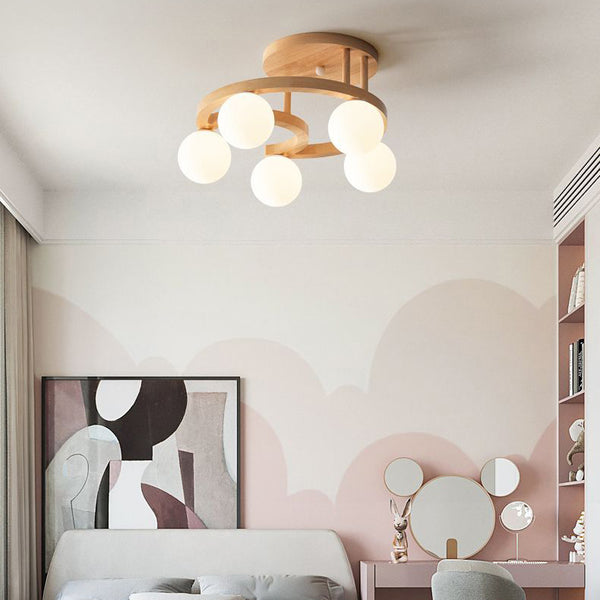 Contemporary Nordic Dome Moon Orbs Rubber Wood Glass Lampshade 3/5 – Light Semi-Flush Mount Ceiling Light For Bedroom
