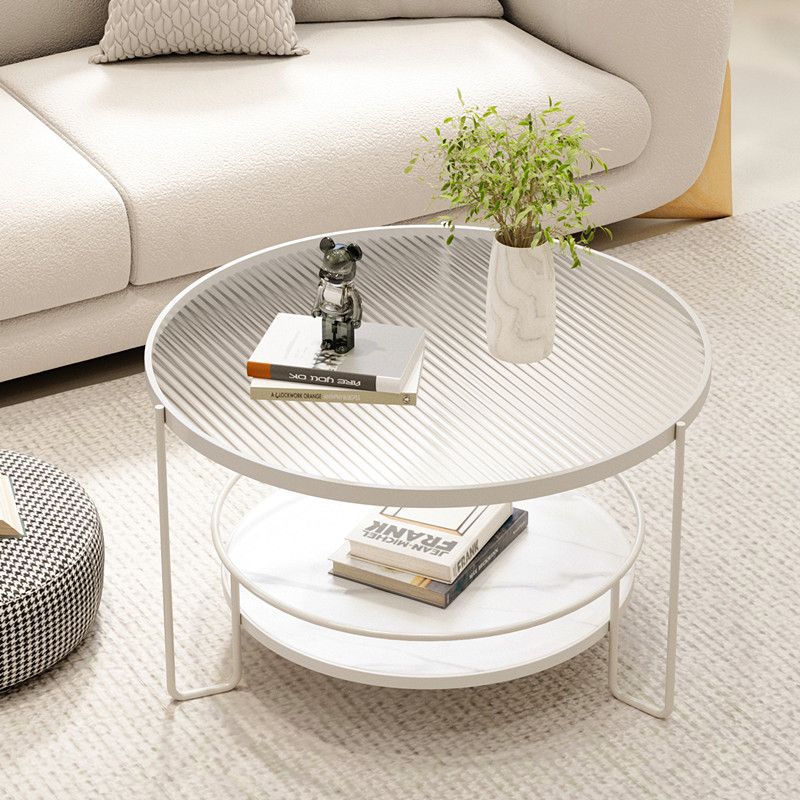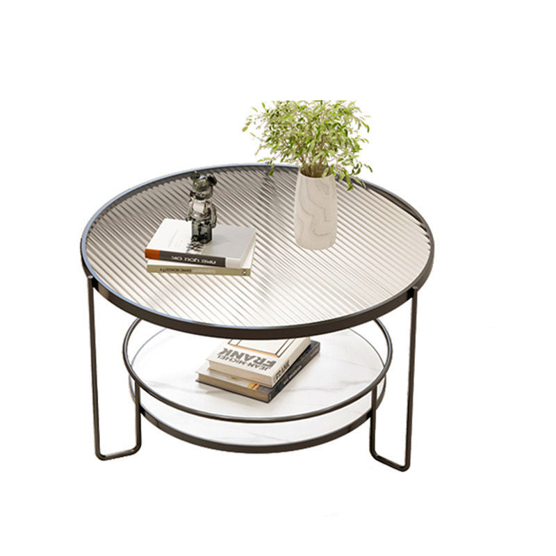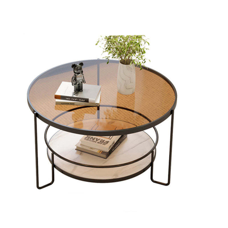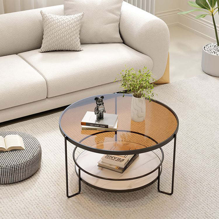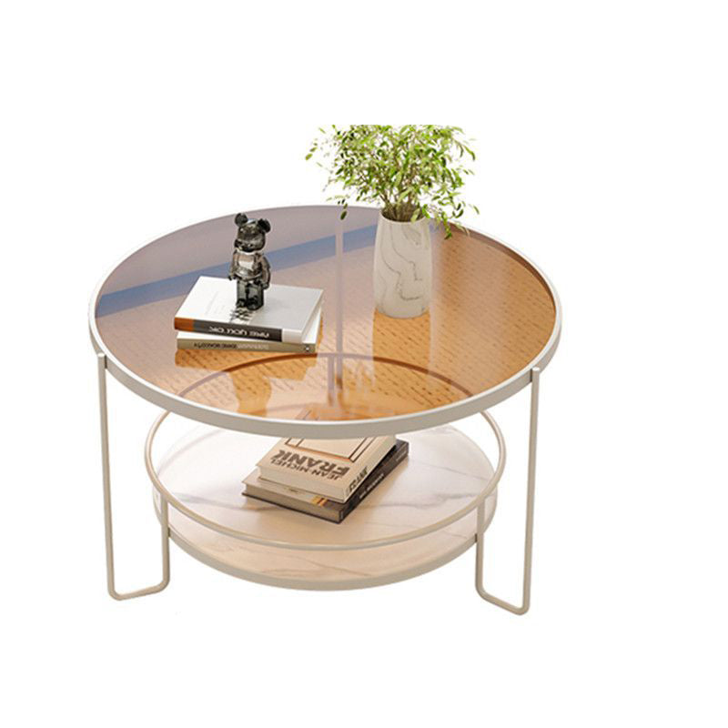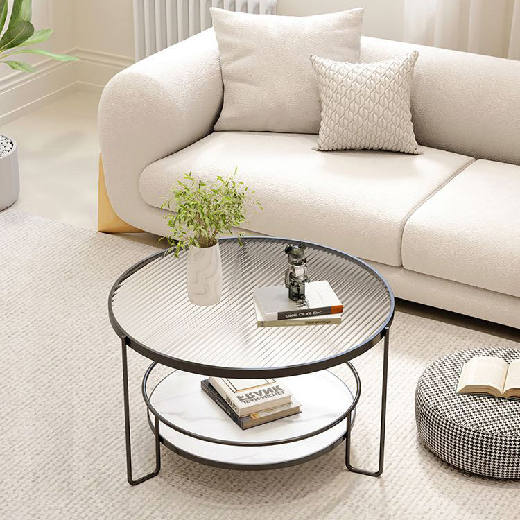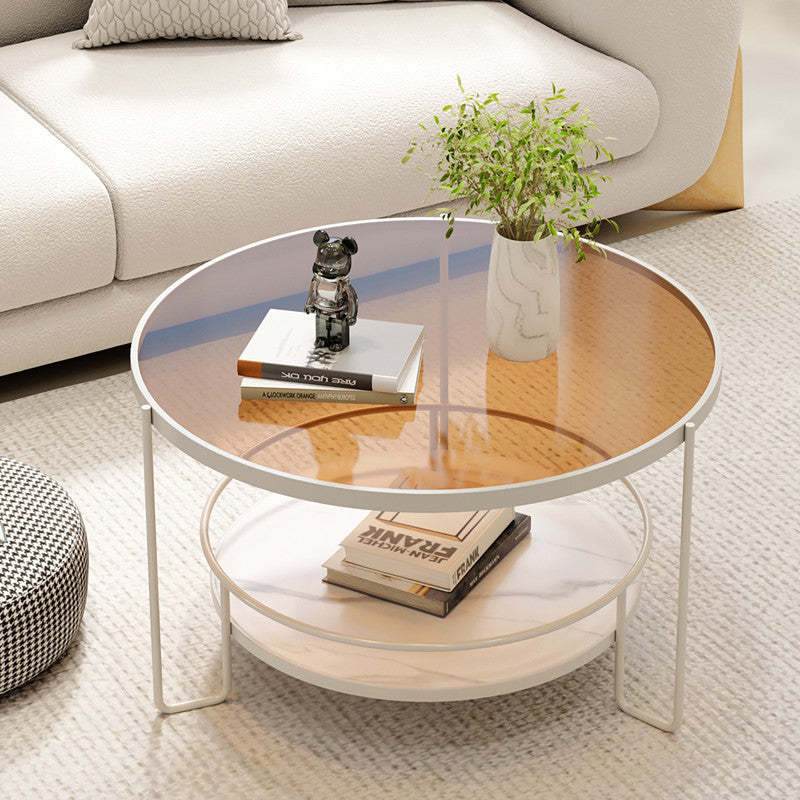 Contemporary Nordic Glass Slab Iron Round Coffee Table With 2 Tiers Storage For Living Room