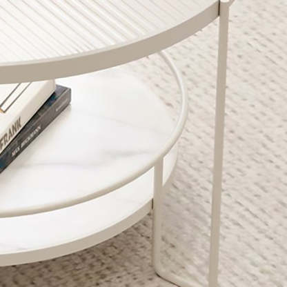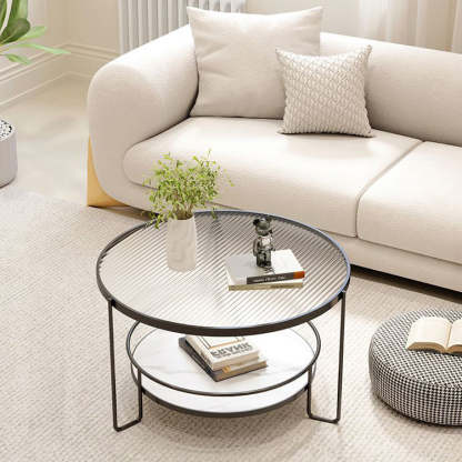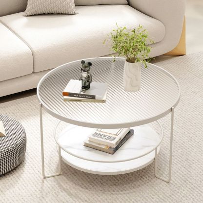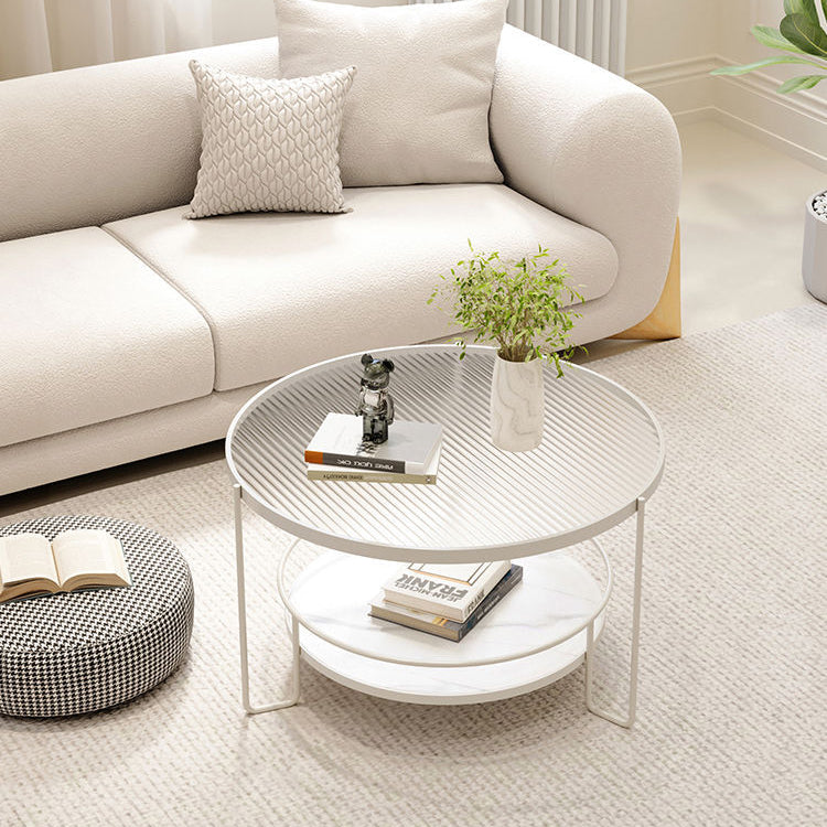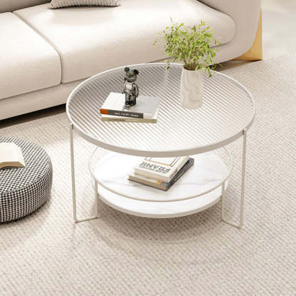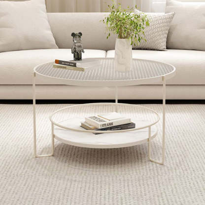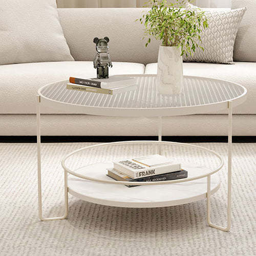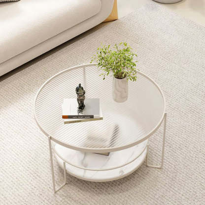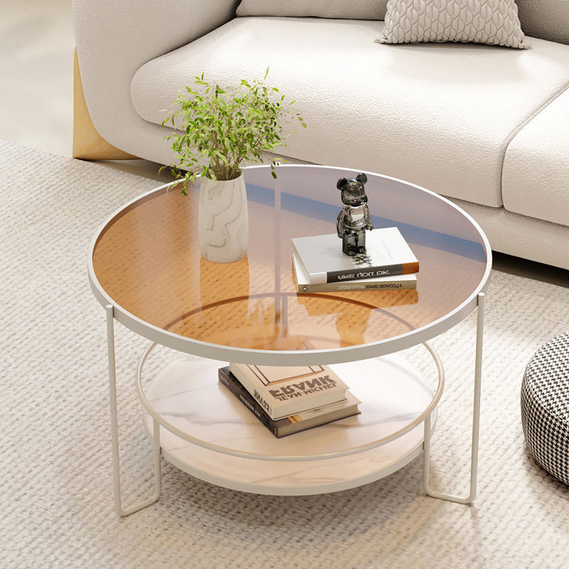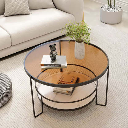 This modern Nordic coffee table features a chic round silhouette with a black or white iron frame. a tea color or striped tempered glass top. and a slab lower shelf. The 2-tier design offers both stylish display and practical storage. making it perfect for small living rooms or cozy balcony setups.