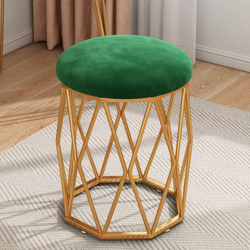 Bring chic charm to your bedroom with this contemporary Nordic vanity stool. crafted from soft velvet and tech fabric with a sturdy iron frame. Featuring a round seat and eye-catching diamond-shaped legs in black or gold. it comes in coffee. blue. green. and white. Designed for stability and durability. it’s perfect for makeup stations. dressing areas. or modern bedroom corners.