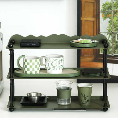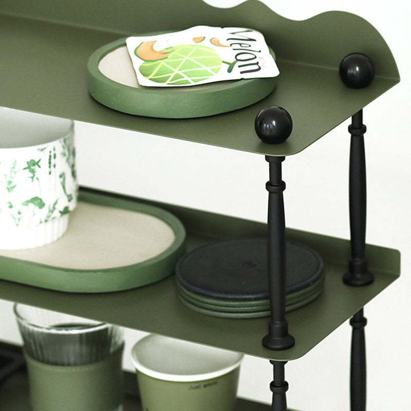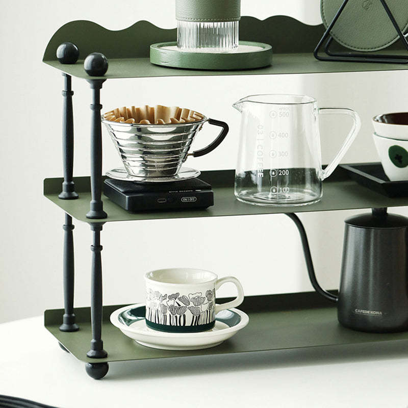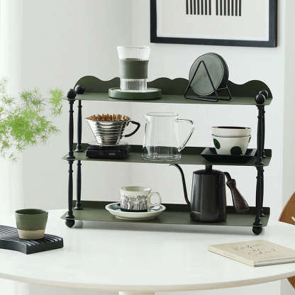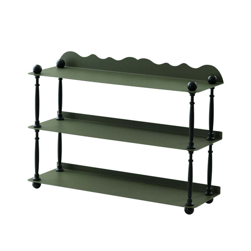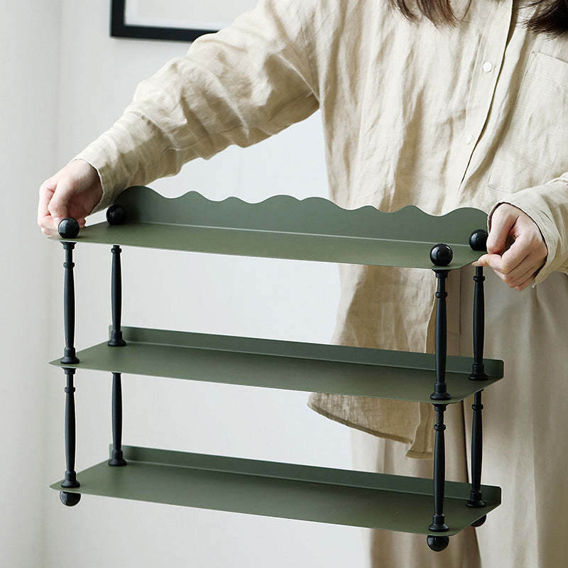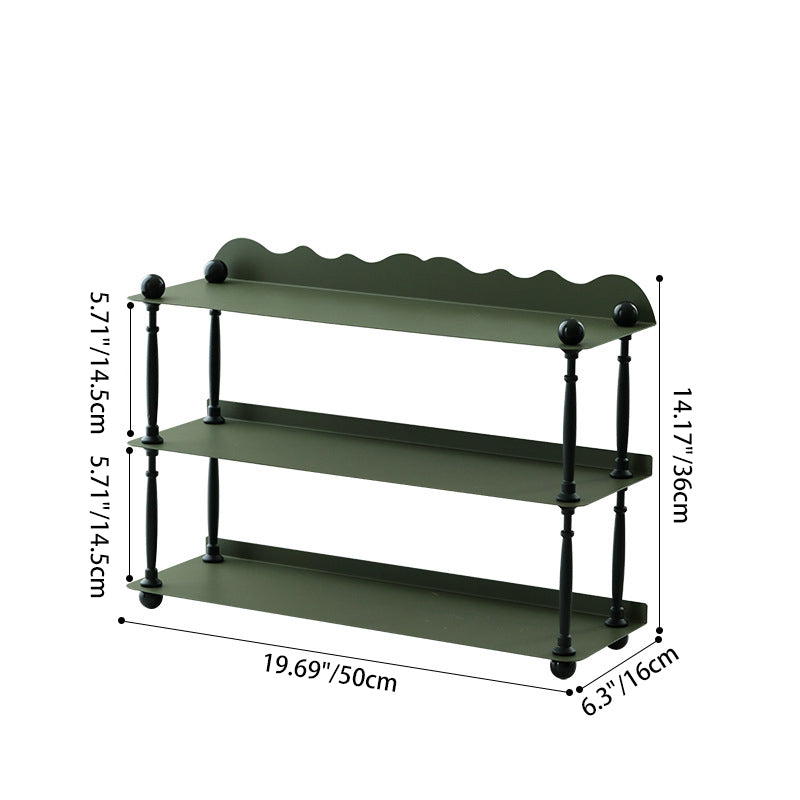 This dark green 3-tier storage rack features a sleek rectangular shape with wave-style edges. combining modern Nordic design with durable wrought iron construction. Ideal for organizing cups. spices. or miscellaneous items in the kitchen or living room. it offers both vertical storage and stylish presentation in a compact footprint. Perfect for countertop or tabletop use.