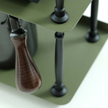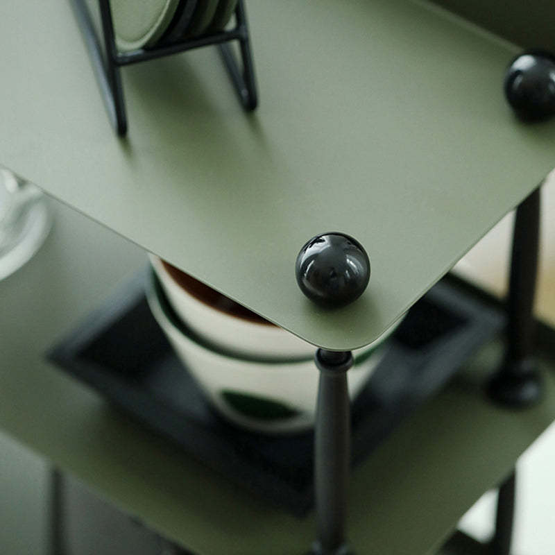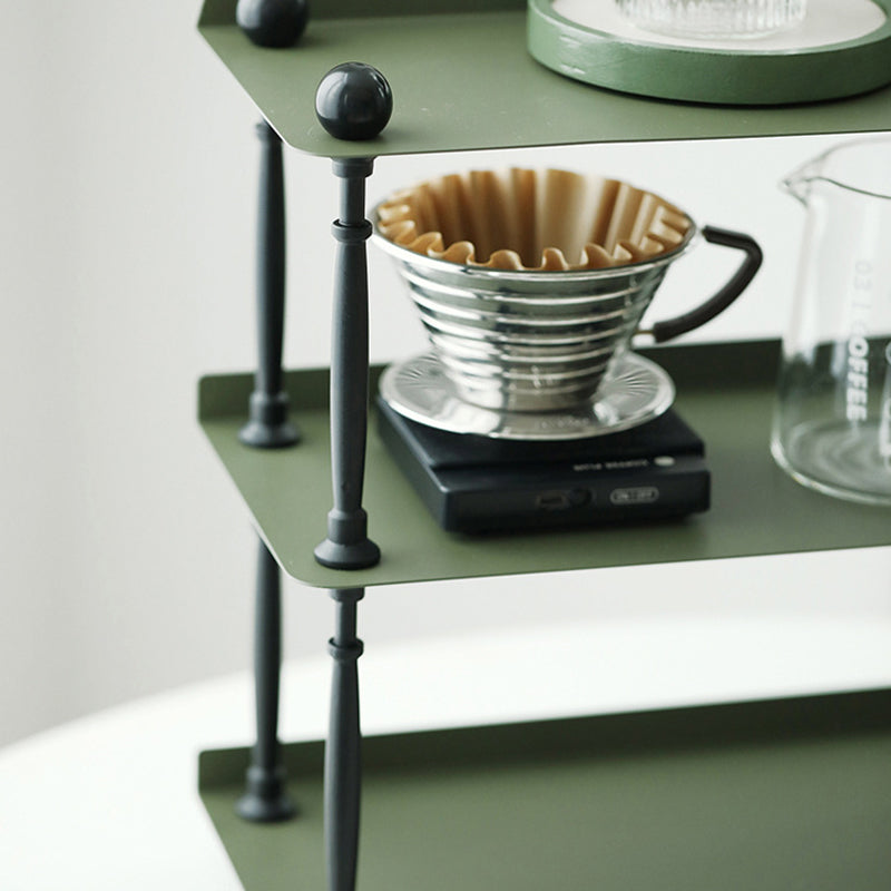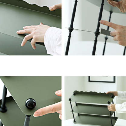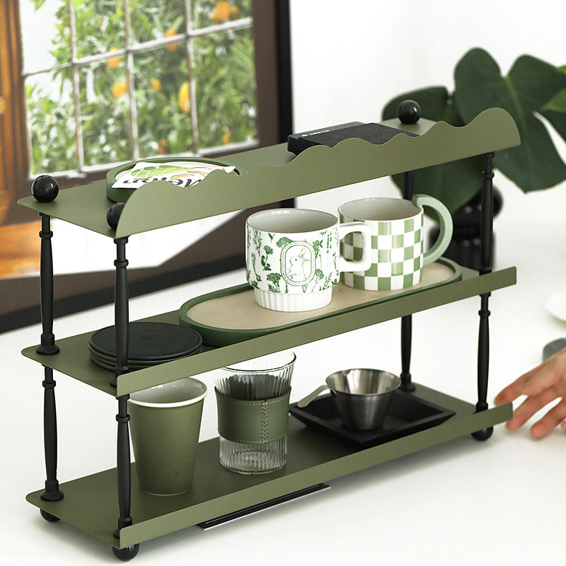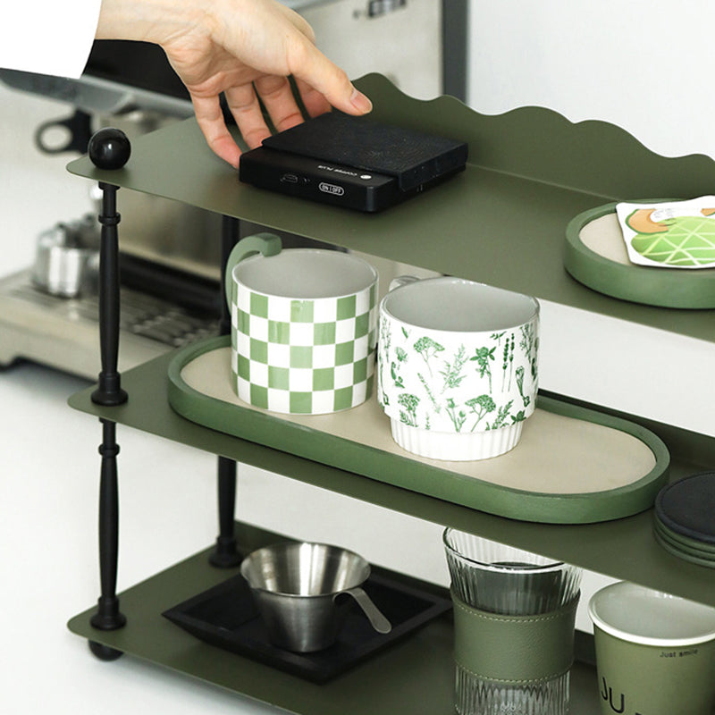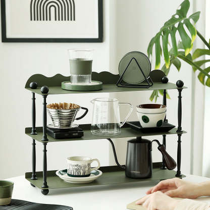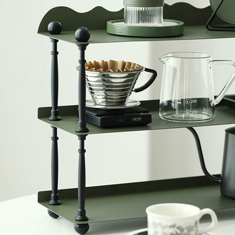This dark green 3-tier storage rack features a sleek rectangular shape with wave-style edges. combining modern Nordic design with durable wrought iron construction. Ideal for organizing cups. spices. or miscellaneous items in the kitchen or living room. it offers both vertical storage and stylish presentation in a compact footprint. Perfect for countertop or tabletop use.