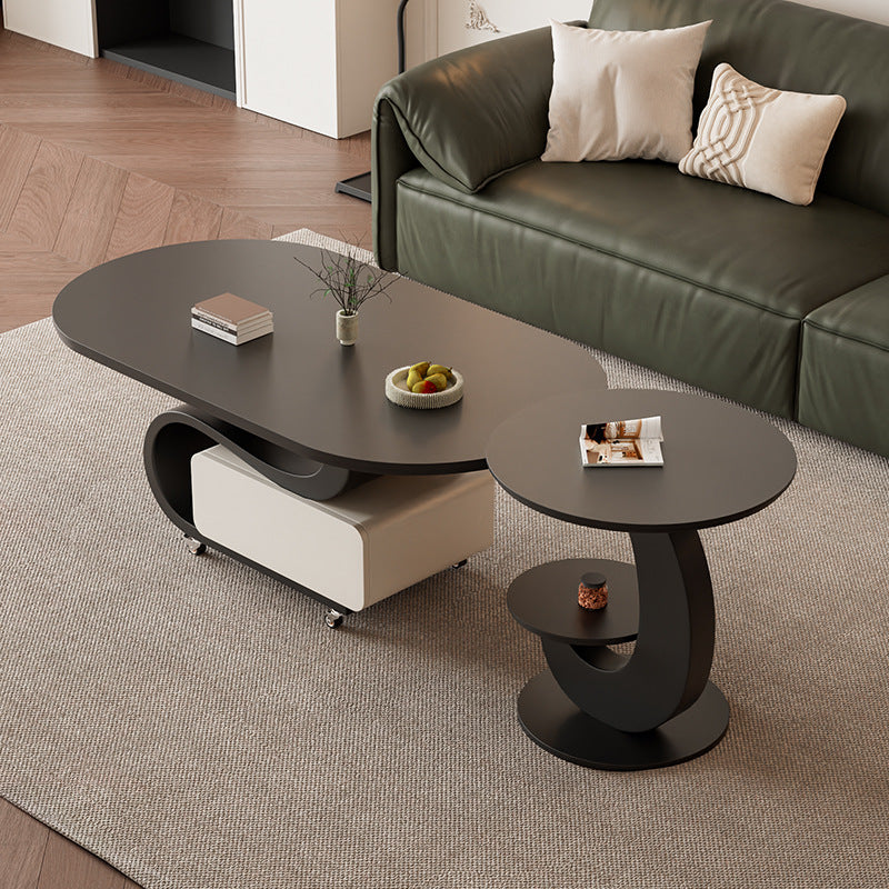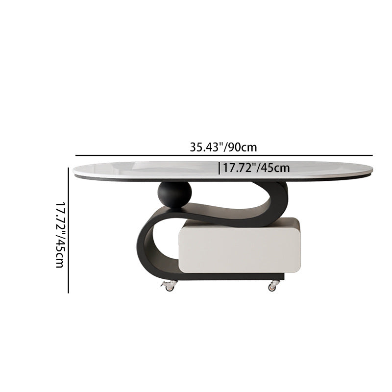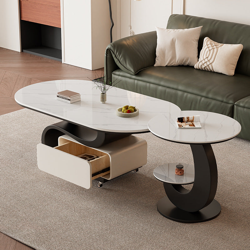 Contemporary Nordic Rock Slab & Carbon Steel Oval Coffee Table With 1-Drawer For Living Room And Bedroom