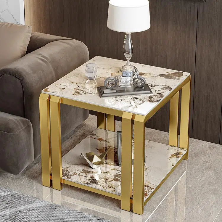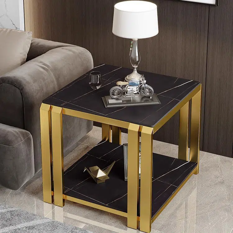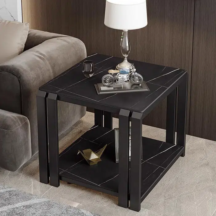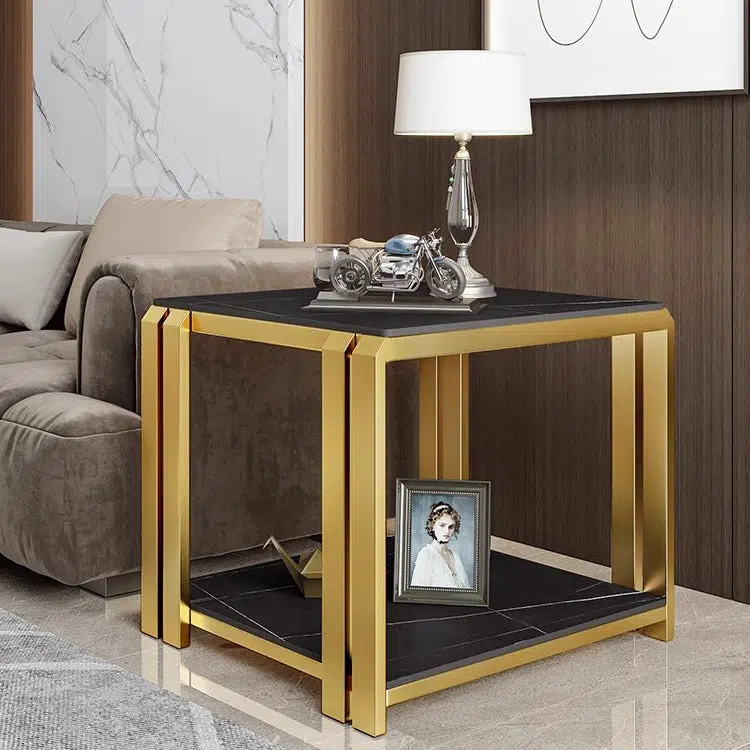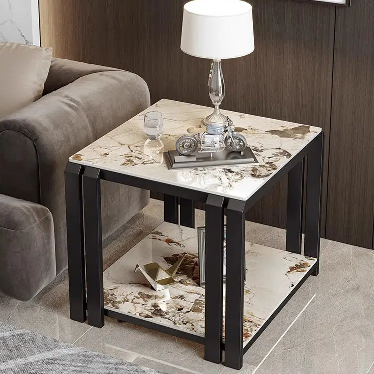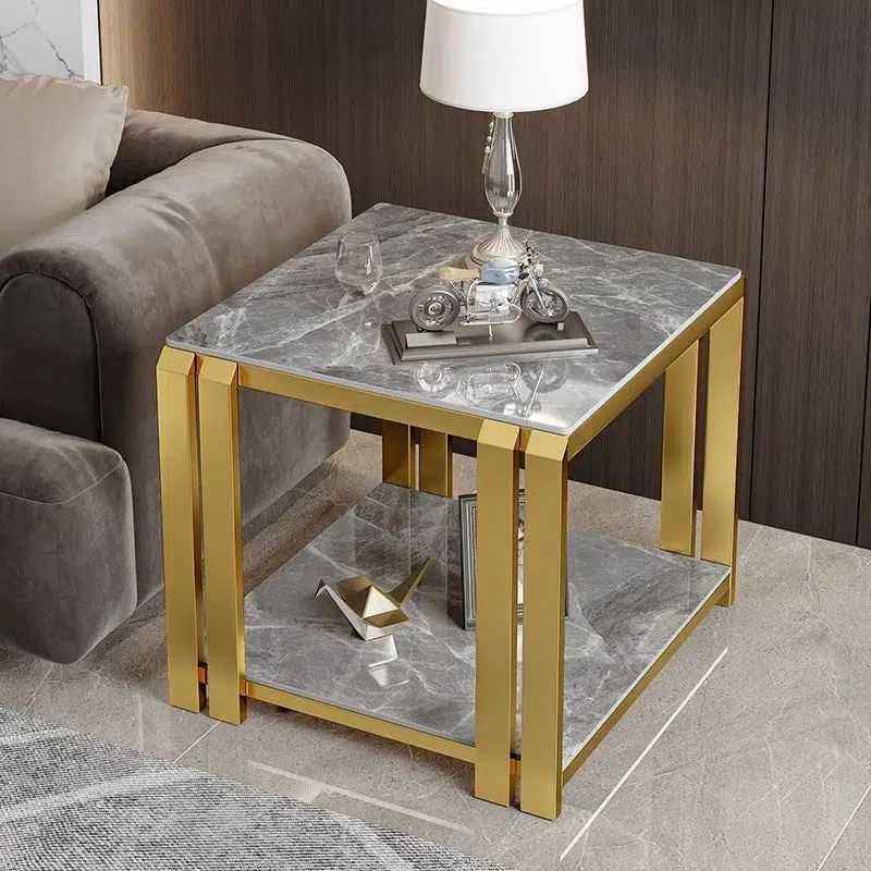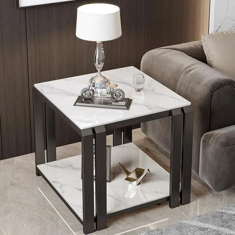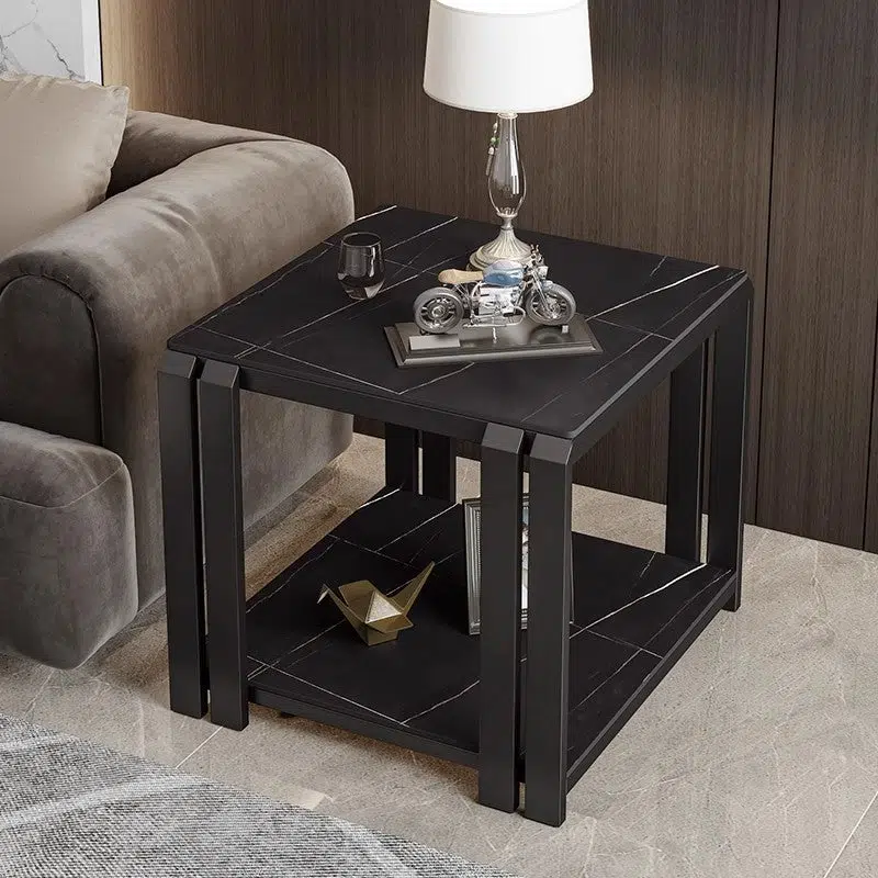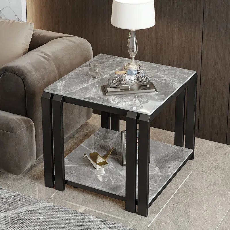 Contemporary Nordic Slab And Metal Square Side Table With 2 Tiers For Living Room