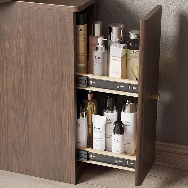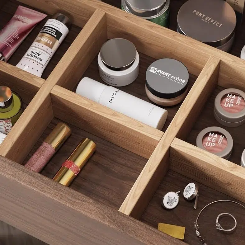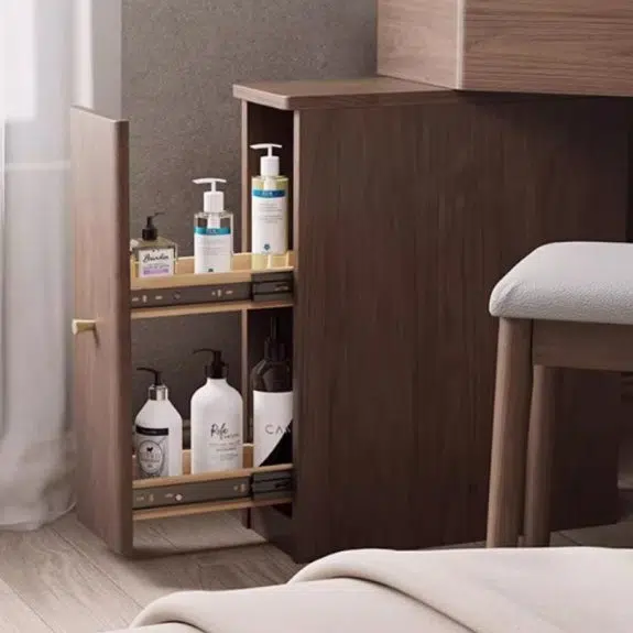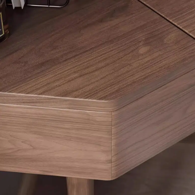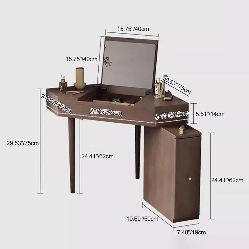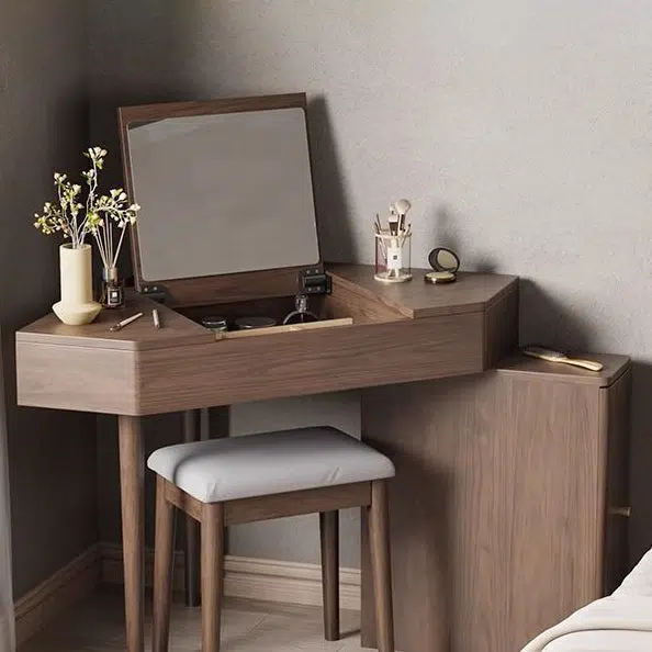 Crafted from solid wood in walnut or natural finish. this contemporary Nordic-style vanity set features a space-saving triangular design ideal for bedroom corners. With a flip-top mirror. partitioned compartments. and hidden storage. it’s perfect for compact living.