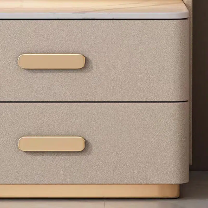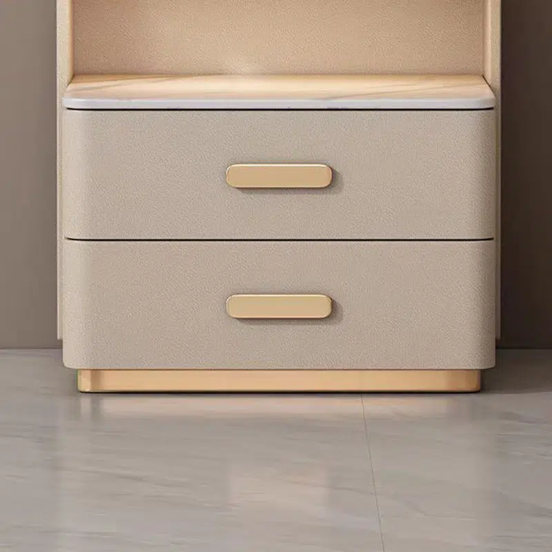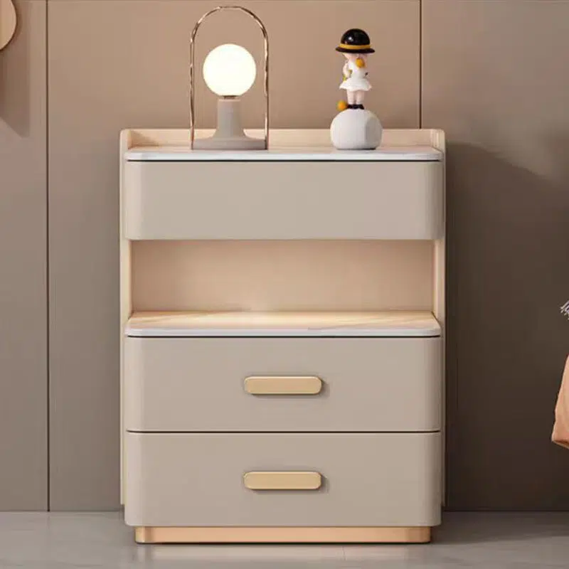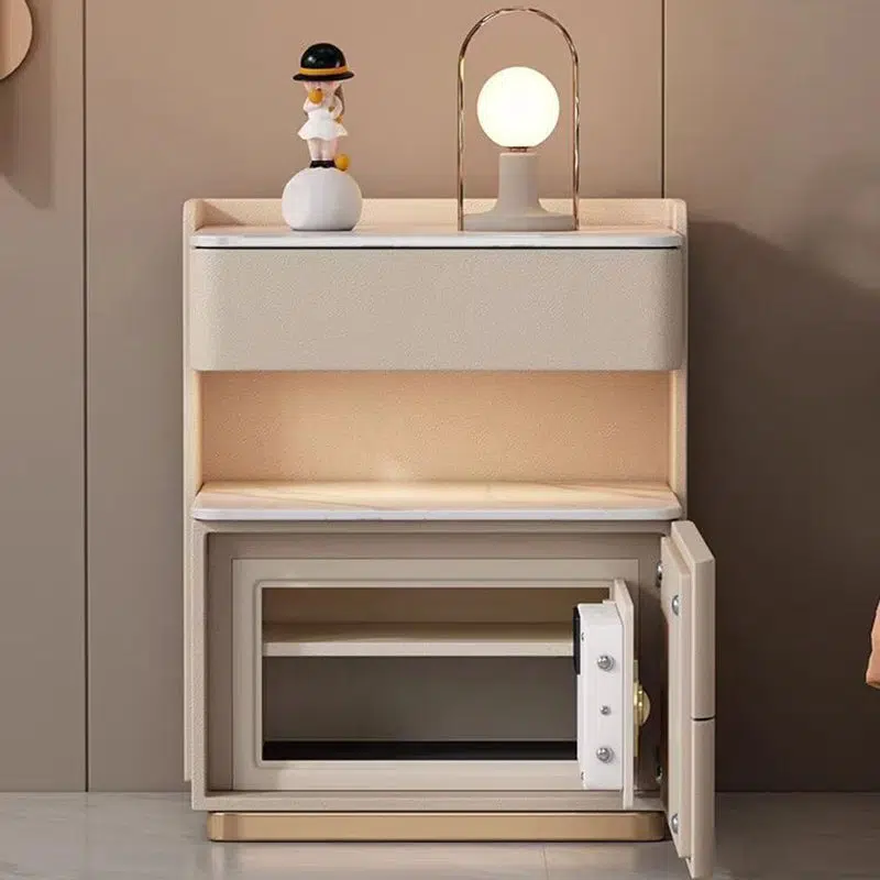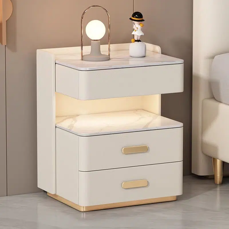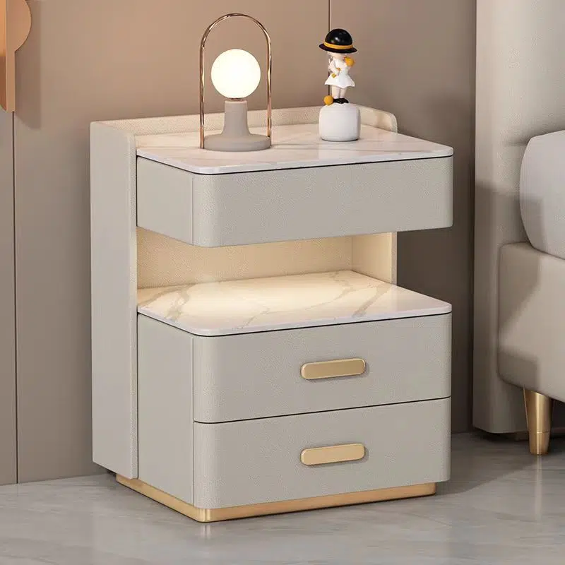 Contemporary Nordic Square Cube Solid Wood Leather Rock Board Sensor Light Safe Nightstand 3 – Drawer For Bedroom