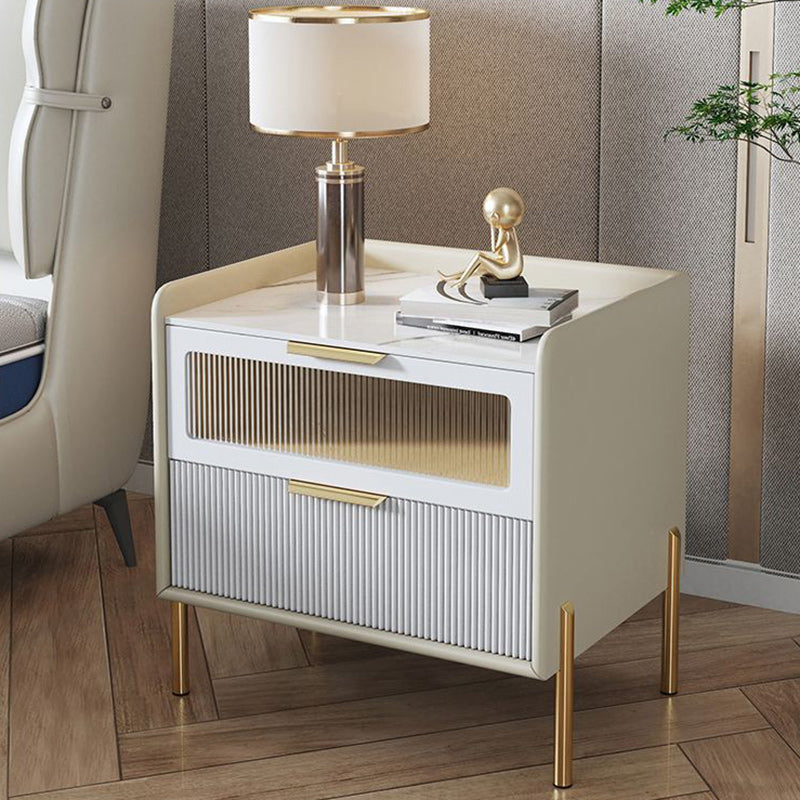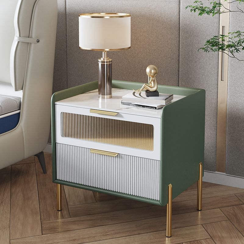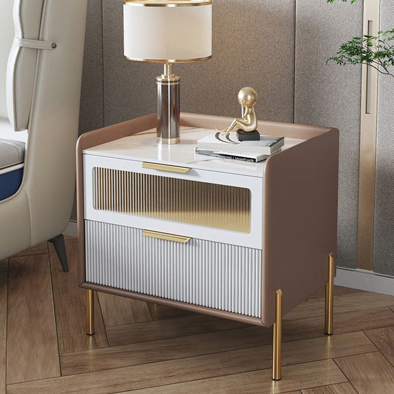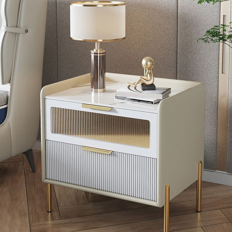 Contemporary Nordic Square Wood Rock Slab Veneer Glass Hardware Stainless Steel Nightstand 2-Drawer For Bedroom