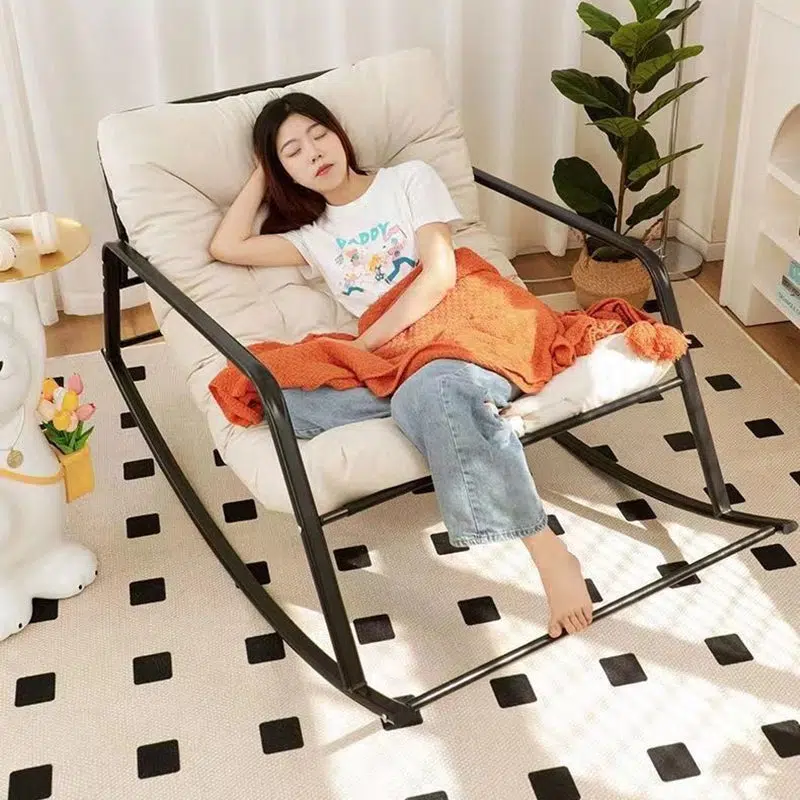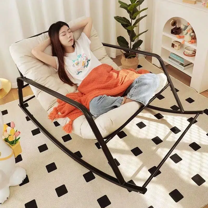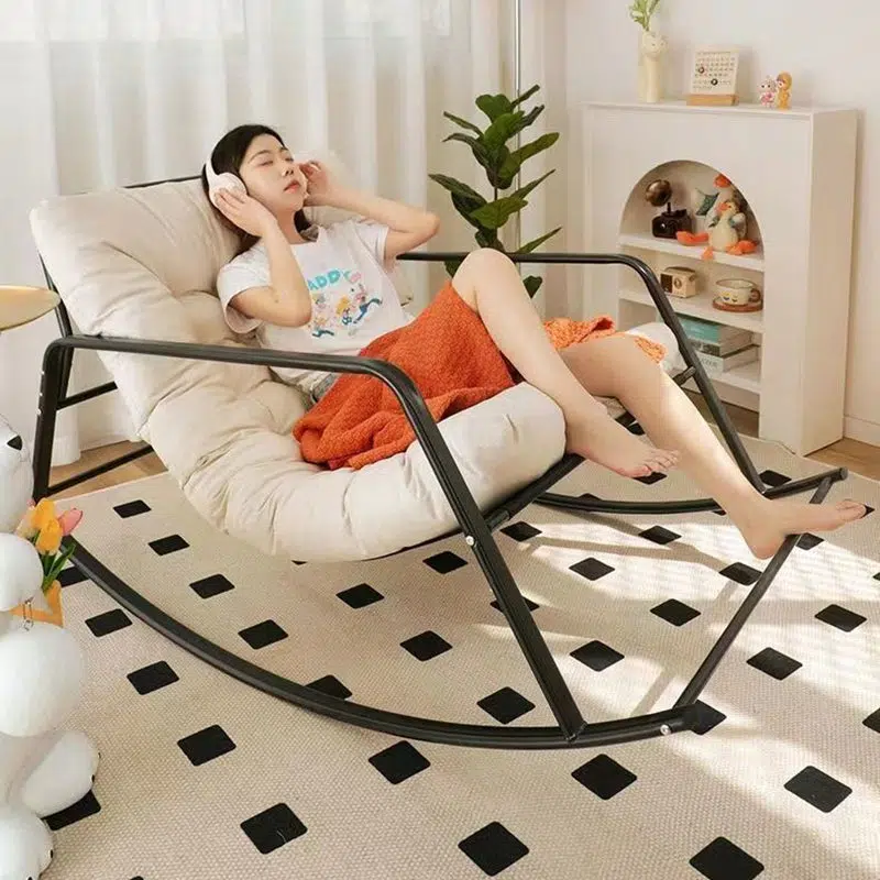 Unwind in style with this moon-shaped rocking chair. crafted from durable tech fabric and carbon steel. featuring a supportive backrest. armrests. and a detachable seat cushion for added versatility. Available in white. orange. and gray??perfect for modern living rooms. bedrooms. or cozy balcony corners.