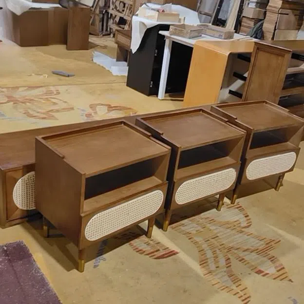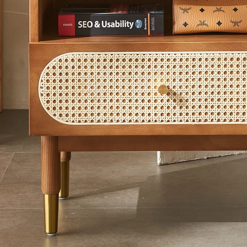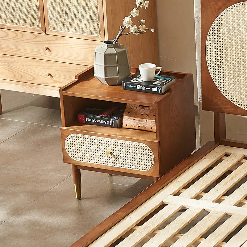 Crafted from natural wood and handwoven rattan. this square nightstand features one drawer for practical storage and showcases rich walnut or sleek black finishes. Perfect for bedrooms or living spaces. it adds warm texture and minimalist style with visible wood grain and organic materials.