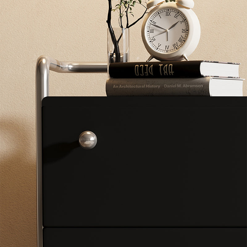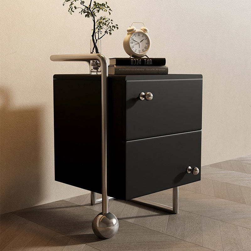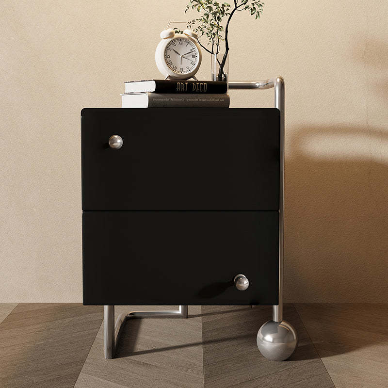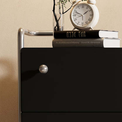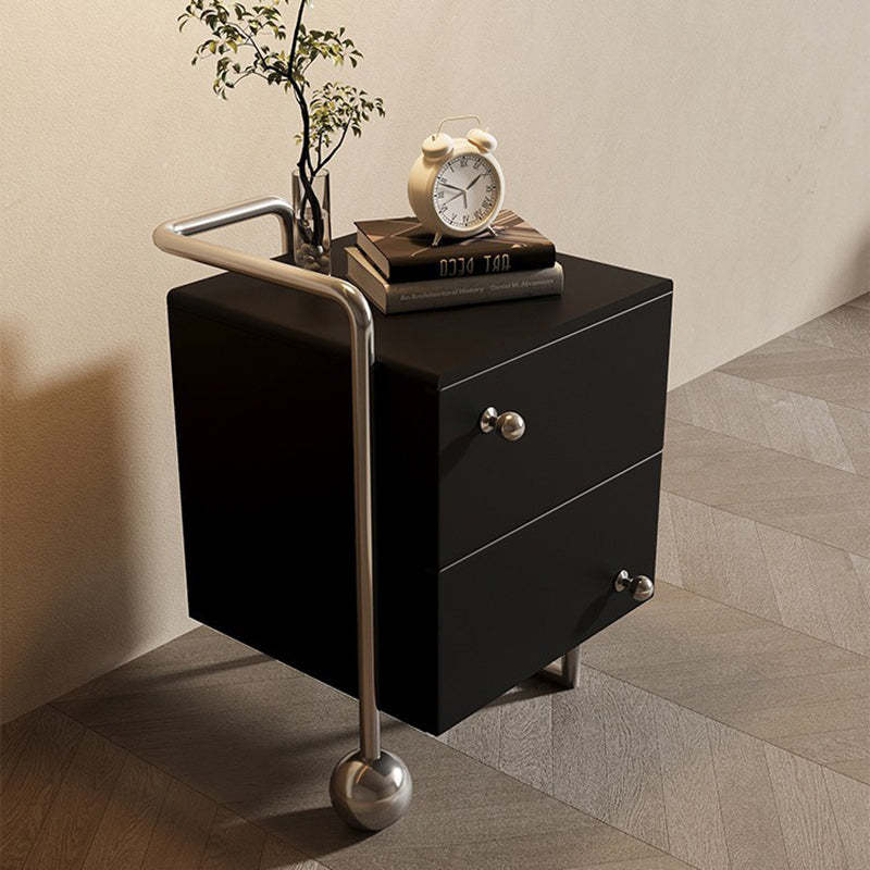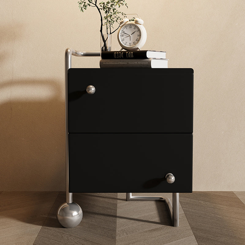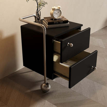 This modern Nordic nightstand features a sleek square design with two spacious drawers. crafted from wood and stainless steel in a bold black finish. Ideal for bedrooms or living rooms. it offers both style and practical storage.