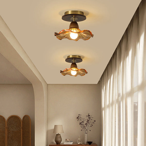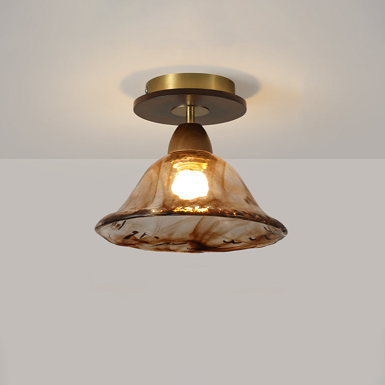 This contemporary retro hallway ceiling light features a bell-shaped glass shade with a skirt-like silhouette. crafted from walnut-toned rubber wood and brass-accented metal in a warm amber finish. The natural wood grain ensures each piece is unique. offering timeless character and soft. ambient lighting for transitional spaces.