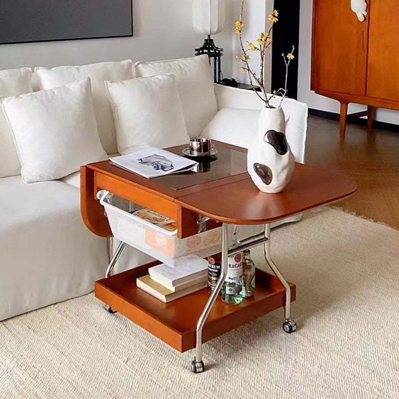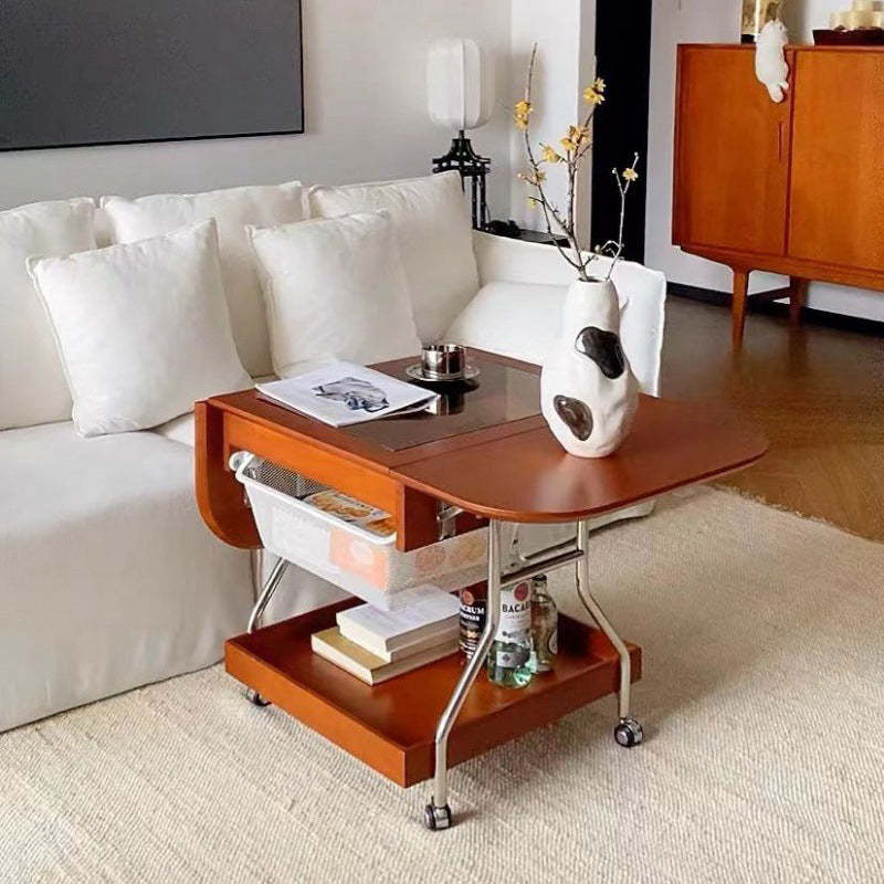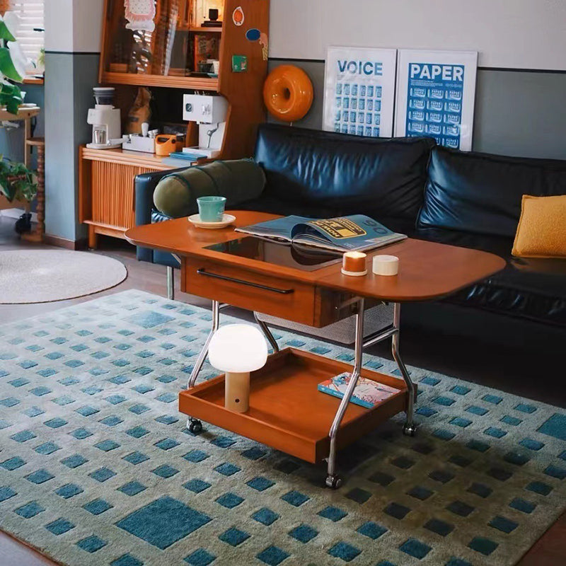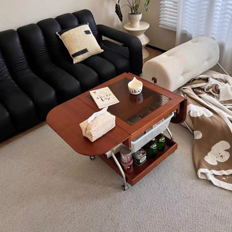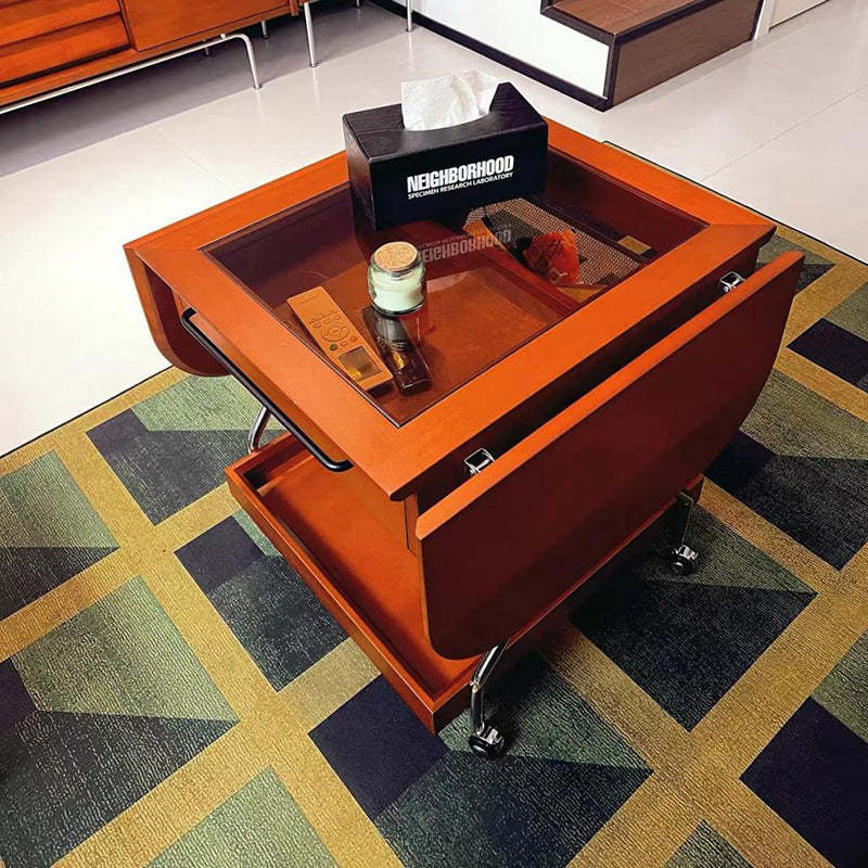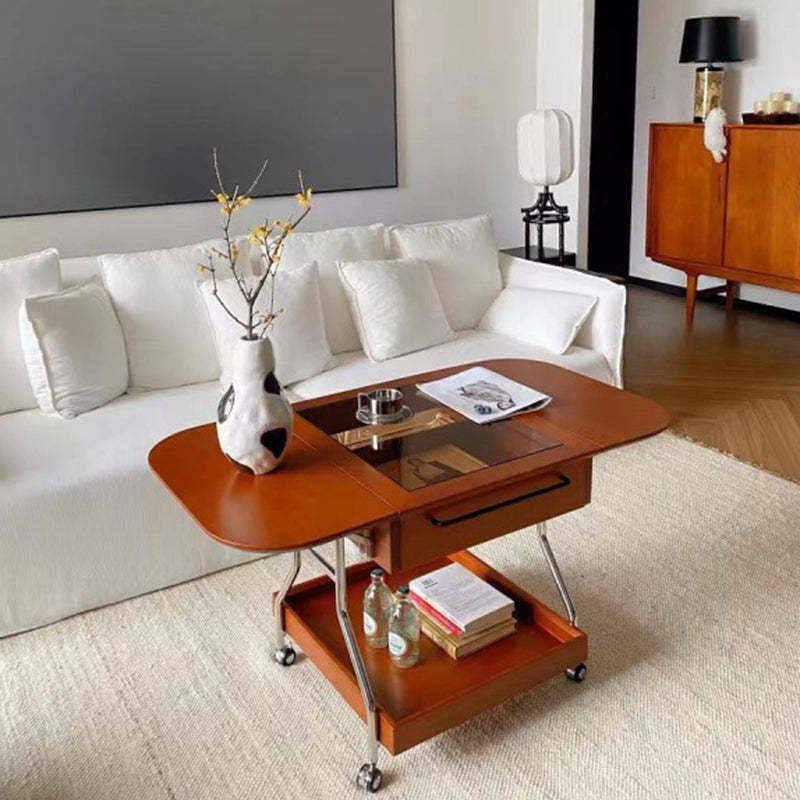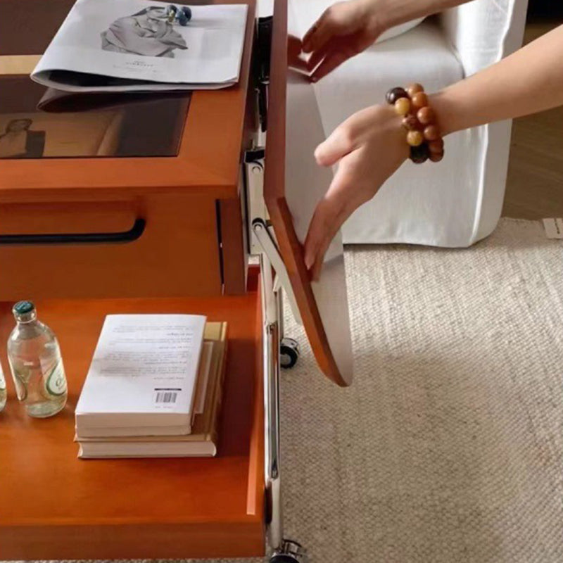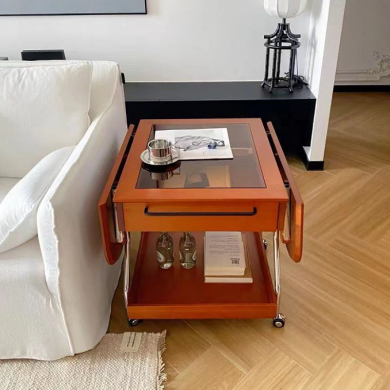 Contemporary Retro Removable Foldable Rectangular Glass Solid Wood Stainless Steel Coffee Table 2-Tier 1-Storage For Living Room