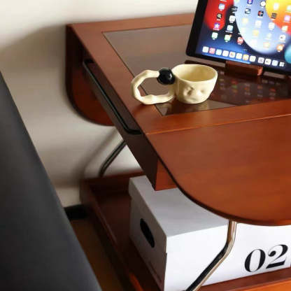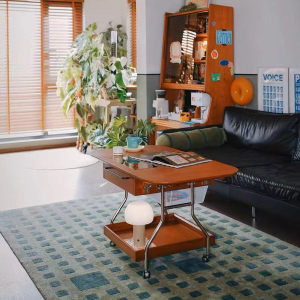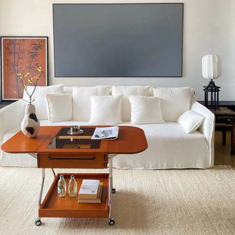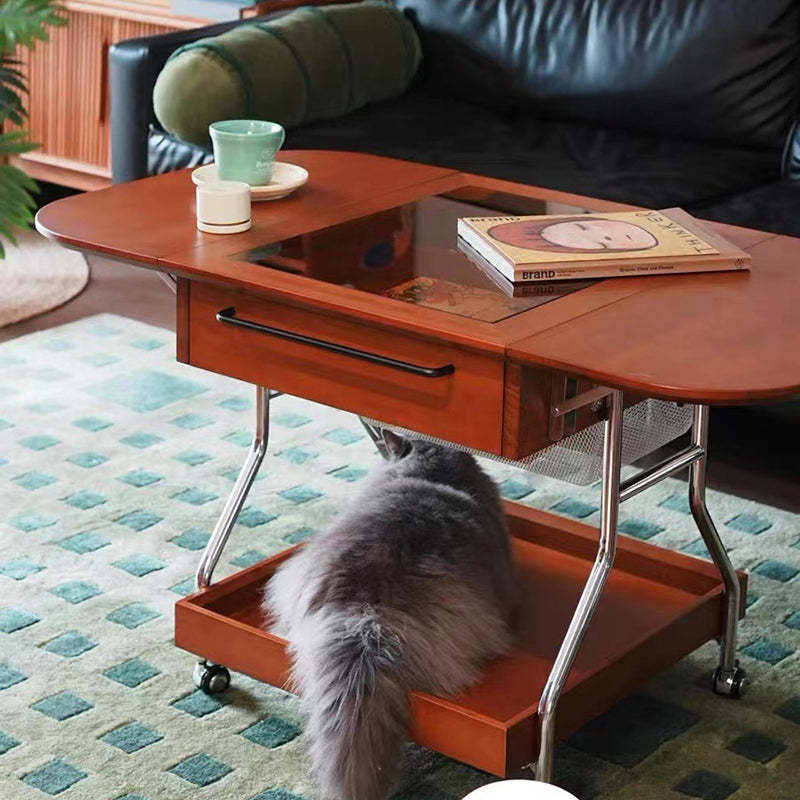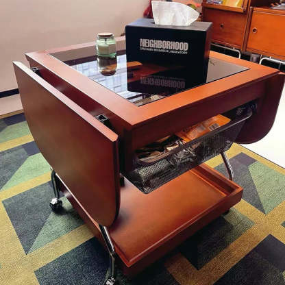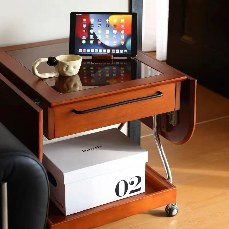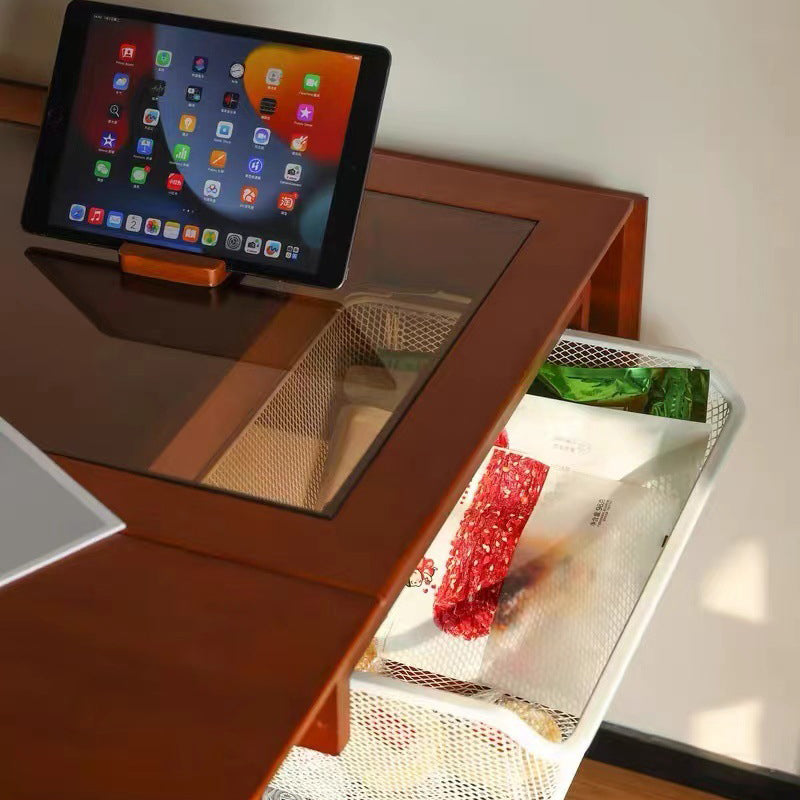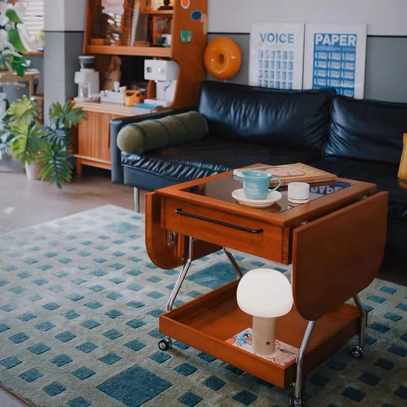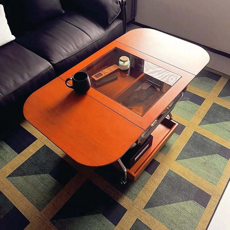 Contemporary Retro Removable Foldable Rectangular Glass Solid Wood Stainless Steel Coffee Table 2-Tier 1-Storage For Living Room
